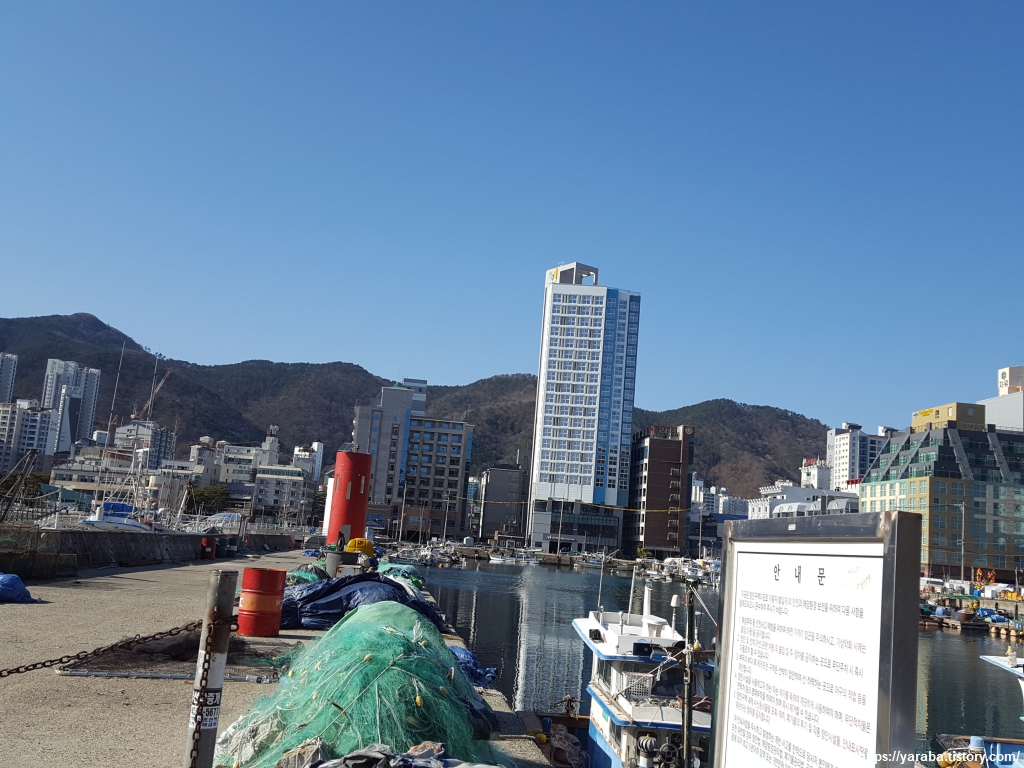 옥포항 포구 주위로는 관처럼 생긴 보관함 20여 개가 설치되어 있었는데 보관함마다 세계의 국기를 그려 놓았고 그 나라에 대한 간단한 소개를 붙여 놓았다. 무슨 용도일까 하는 호기심이 있었는데 찾아보니 어민들이 사용하는 어구 보관함이라고 한다. 항구에 널브러져 미관도 해치고 안전에도 문제가 있는 어업 도구들을 정리해서 보관하도록 한 시설이었다. 단색의 보관함이 미관에 문제가 있으니 고육지책으로 국기도 그려 넣고 나라 소개도 붙인 모양이다.