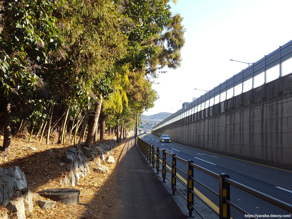오션 플라자 앞을 지나 도로변을 걷기 시작한다. 이번 여정에서 굴다리나 다리 아래로 여러 번 가로질러갔던 거가대로 옆의 인도를 걸어간다.