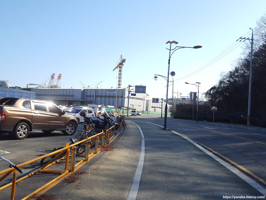 조선소 주위를 걷는 것이라 삭막하지 않을까! 하는 상상을 했는데 1970년대에 세워진 조선소의 역사만큼이나 조선소 쪽으로 키 큰 메타세쿼이아 나무가 쭉쭉 뻗어 있고 거가대로 도로 쪽으로는 아름드리 벚나무들이 줄지어 서있다. 녹음이 올라오기 시작하는 봄이면 이곳은 벚꽃으로 환상적인 풍경을 만들겠구나 하는 상상이 되었다.