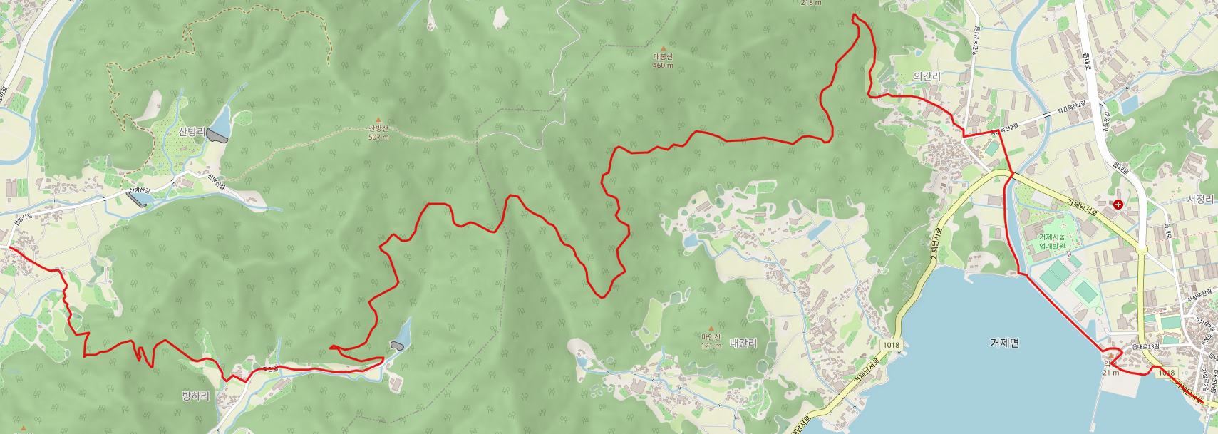 임도를 내려오면 부춘 마을(7.9Km)에 닿고, 오망천삼거리(10.3Km)를 지나 거제 파출소(14.6Km)에서 여정을 마무리한다.