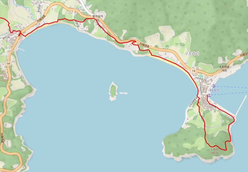 남파랑길 21코스를 끝내면 22코스의 본격적인 등산이 시작되기 직전인 망치몽돌 해수욕장까지 22코스를 이어서 걷는다. 초반 구조라성(1.7Km)까지 가려면 수정산(148미터)을 넘어야 한다. 구조라성을 지나면 중간에 잠시 국도변을 걷지만 대부분 평탄한 길을 통해서 구조라 해수욕장을 거쳐서 망치몽돌 해수욕장(5.3Km)에 이른다. 숙소는 경로 상에 있는 거제도 보물섬펜션으로 예약한다. 마을 입구에 마트와 편의점이 있다.