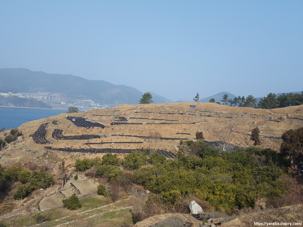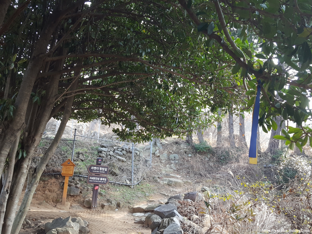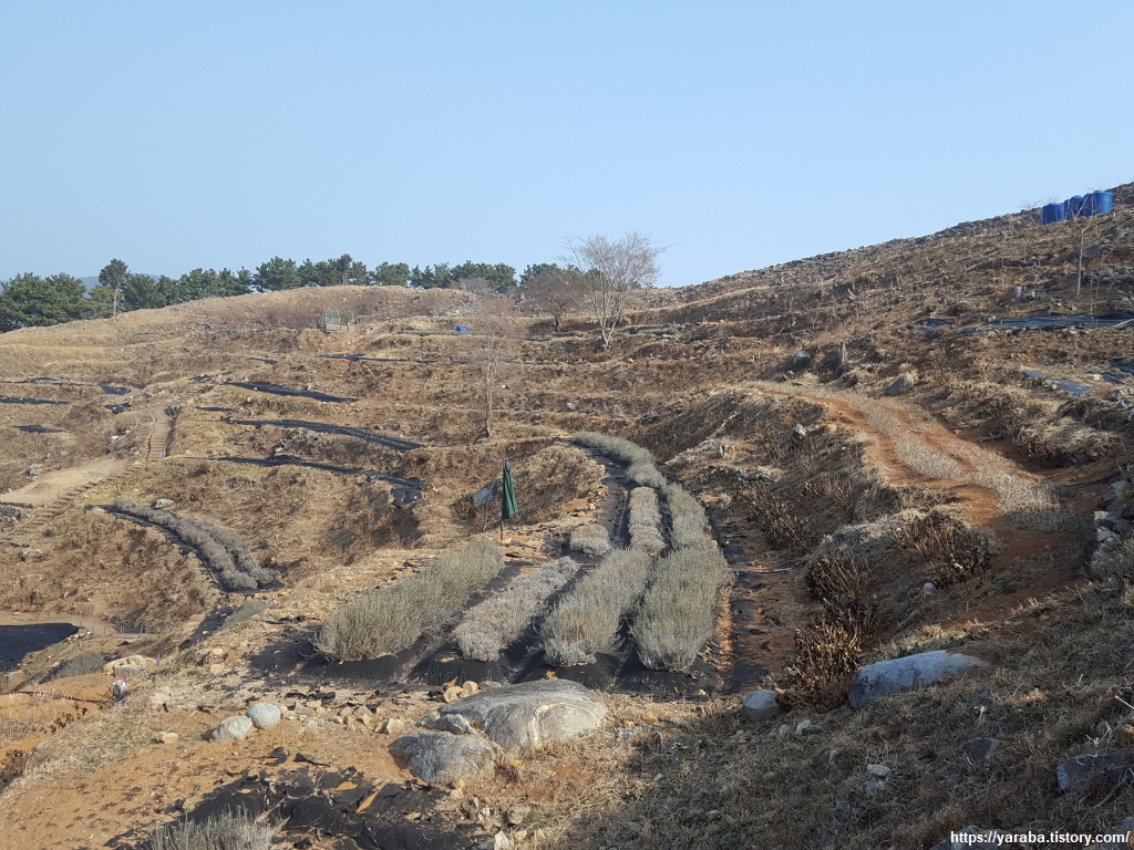 조선 성종 당시 성을 쌓았을 당시의 모습은 알 수 없지만 지금은 성터에 라벤더를 비롯하여 다양한 식물을 심어 놓았다. 지금은 겨울이라 볼품없지만 꽃이 만발하는 계절이면 완전히 다른 세계가 펼쳐질 곳이다. 라벤더가 여러해살이풀이고 영하 5도까지는 견딘다고 하니 거제에서는 노지 월동도 가능할 것이다. 좋은 선택이었다 싶다.