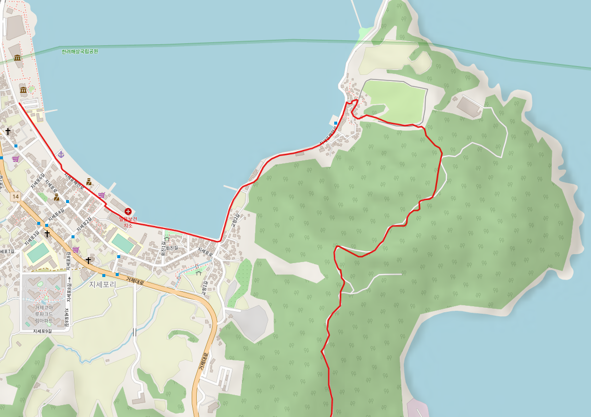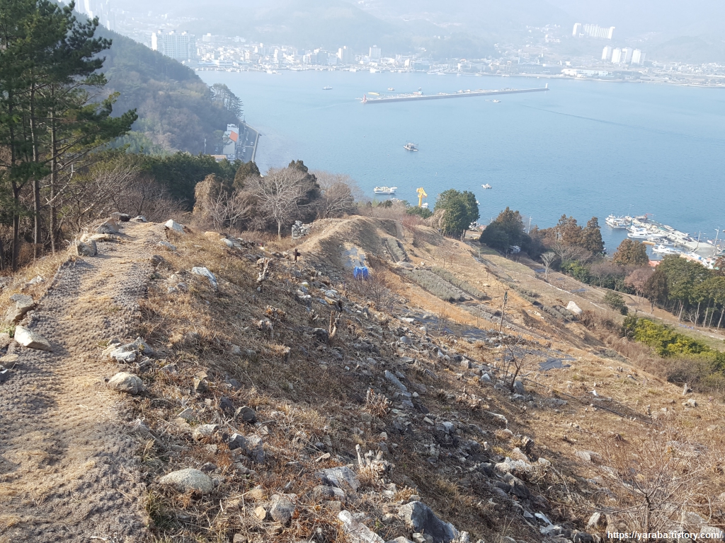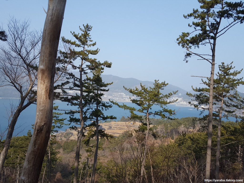 듬성듬성한 나무숲 사이로 보이는 지세포항과 지세포성을 뒤로하고 길을 이어간다.