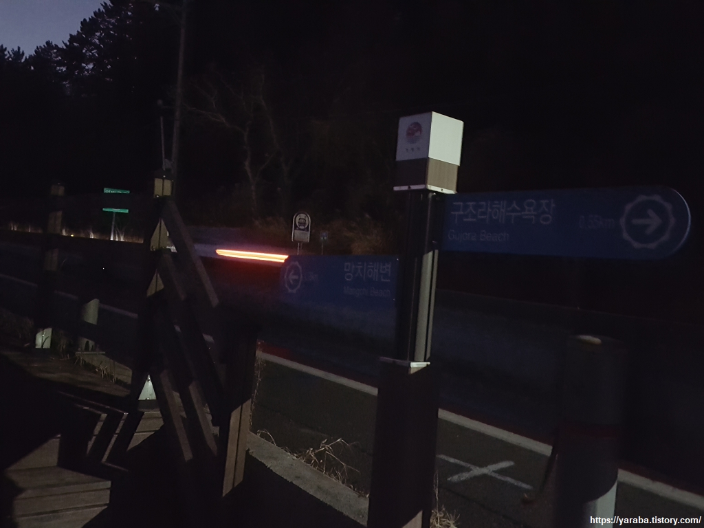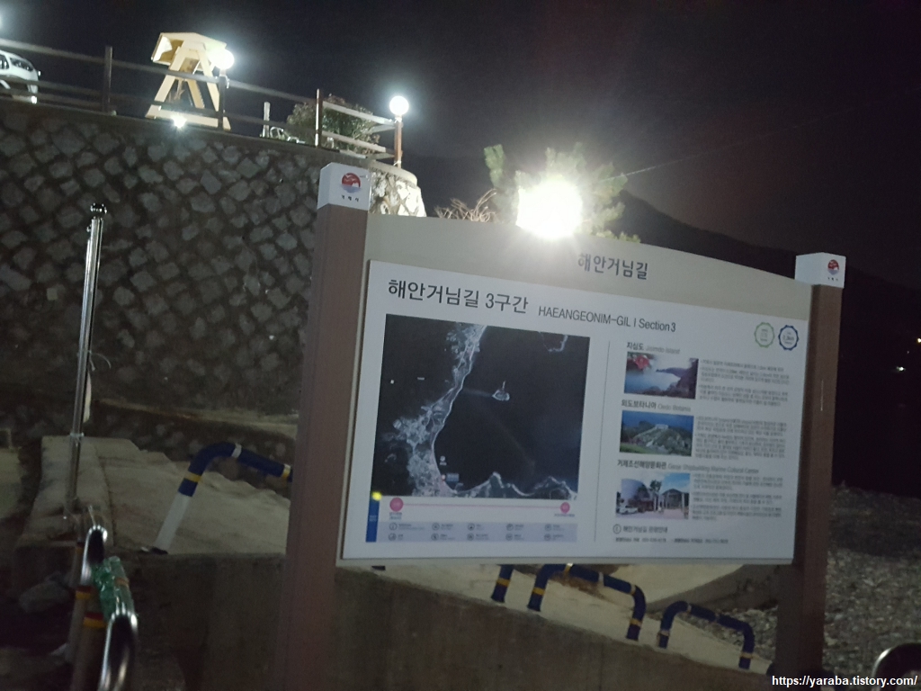 구조라 해수욕장의 가로등이 켜지나 싶더니 주위는 금세 어두워져 야간 걷기를 해야 되는 상황이 되었다. 구조라 해수욕장을 나오면 14번 국도를 따라서 길을 이어간다.