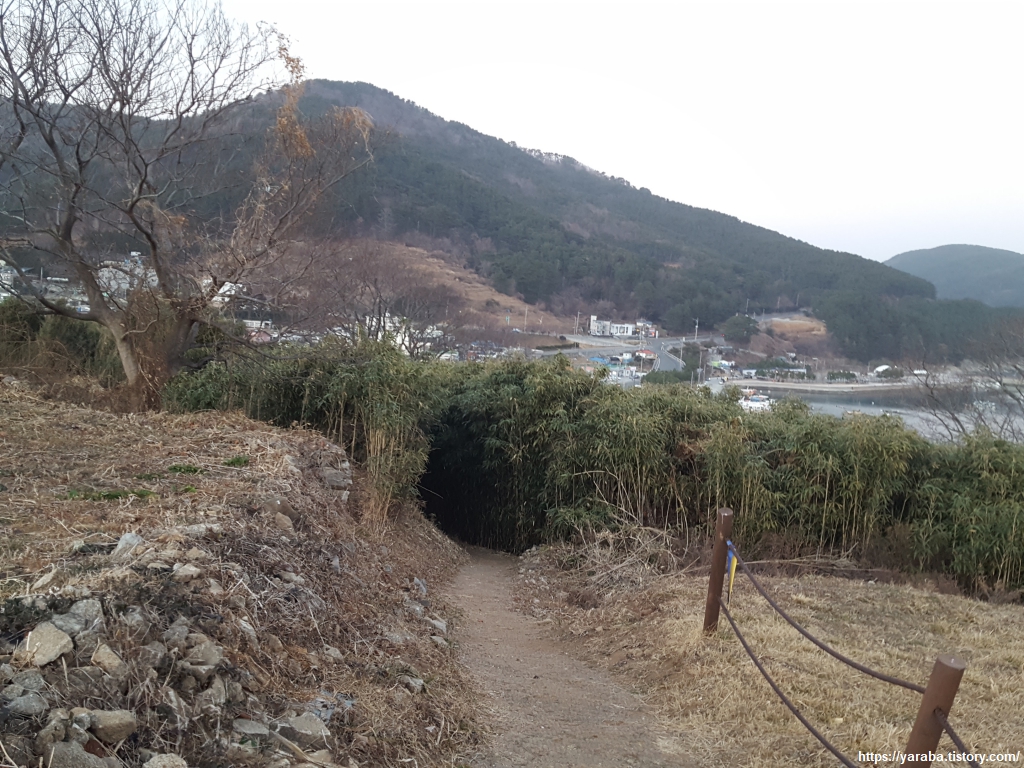 열심히 길을 찾아 내려가는데, 어느 순간부터 노란 남파랑길 리본이 보이지 않는다. 길을 놓친 것이다. 여러 갈래의 탐방길 사이에서 일단 해안으로 내려가는 방향으로 길을 찾다 보니 어느덧 눈앞에 남파랑길 표지가 다시 등장한다. 깊은 숲 속, 해가 져서 주위는 더욱 어두운데 사람이 많이 다니지 않는 길인지 낙엽이 수북하게 쌓인 길을 통과해 나올 때는 조금의 긴장감도 있었다.