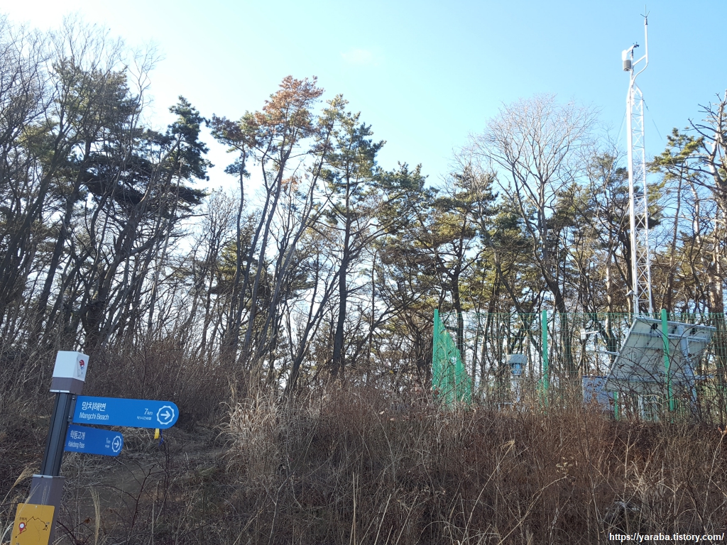 남파랑길은 임도를 계속 따라가지 않고 기상 관측 시설 인근에서 숲길로 빠져 학동 고개로 내려가는 등산로와 합류한다.