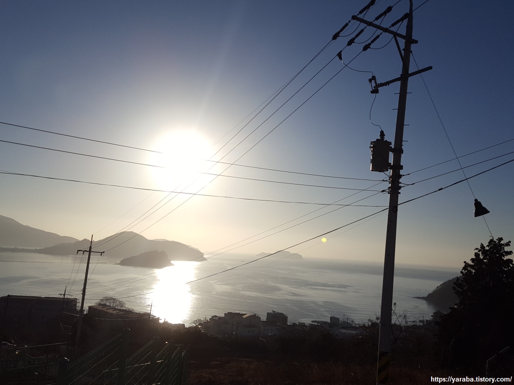 헉헉거리며 오르막을 걷다가 잠시 숨을 돌리며 뒤를 돌아보면 따스한 햇살로 서늘했던 아침을 깨우고 있는 태양이 찬란하다. 은빛으로 빛나는 바다 위로 앞으로는 윤돌도와 구조라의 수정산이 멀리는 내도가 눈에 들어오는 풍경이다.