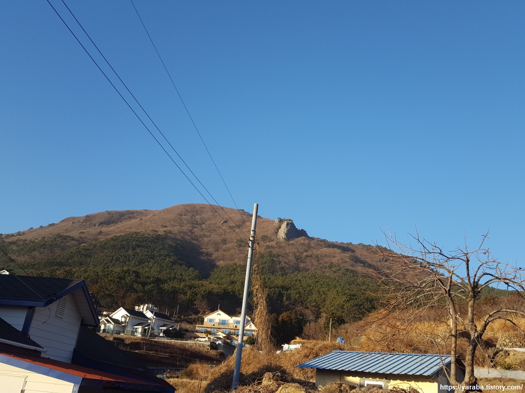 망치 마을의 펜션촌 골목을 빠져나가 오르막길을 시작한다. 오늘은 초반부터 오르막길이다. 좌측으로는 암벽 등반가들이 좋아하는 거제 애바위라는 60미터 높이의 암벽이 존재를 뽐내고 있다. 70도에서 110도에 이르는 경사임에도 초급 또는 증급 코스라고 하니 암벽 타기는 맛보기 전에는 전혀 모를 세계이기는 하다.