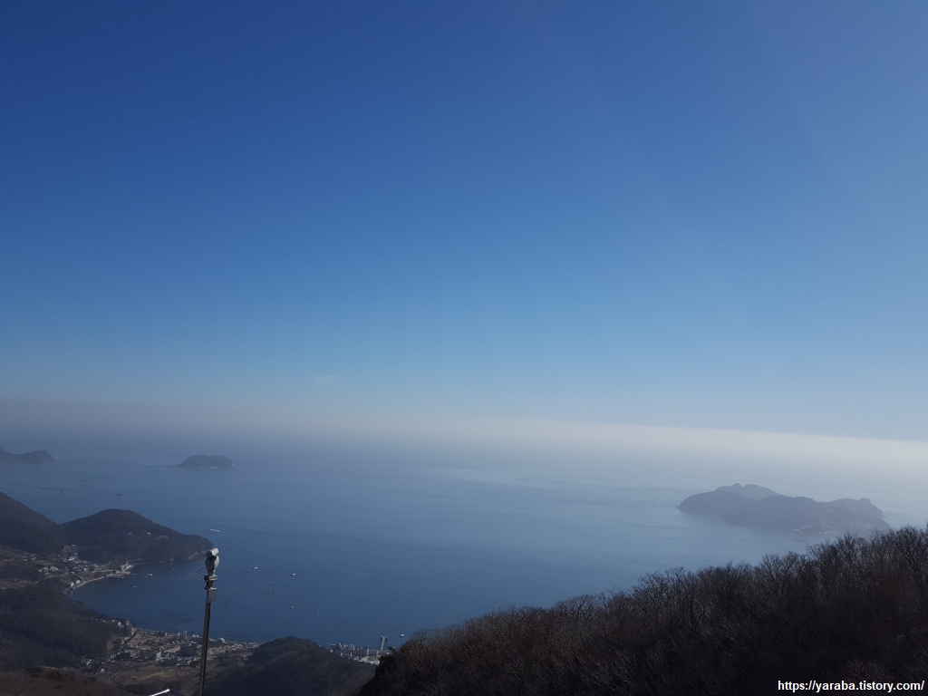 학동 마을과 앞바다의 모습 탁 트인 시야, 새들이 땅을 바라보면 이런 느낌이겠구나 싶다. 멀리 외도와 내도도 풍경의 한자리를 차지하고 있다.