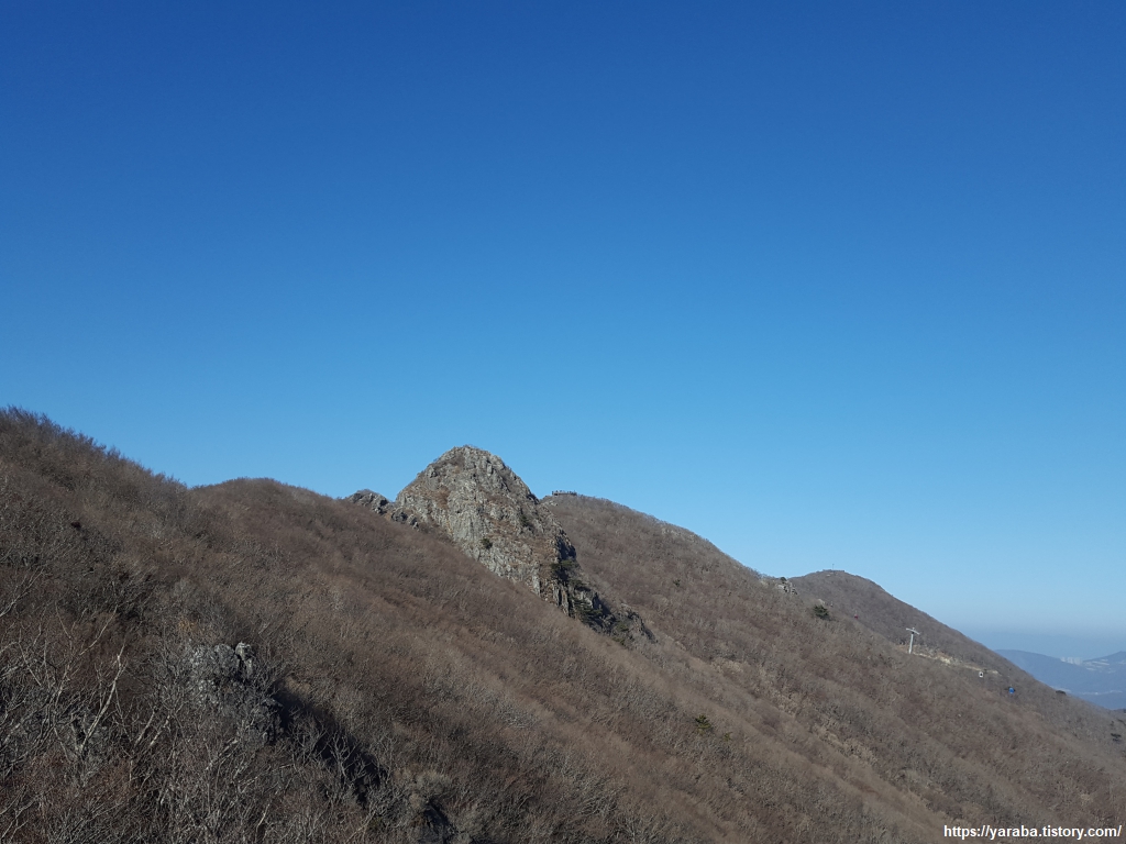 정상부에서 존재감을 뽐내는 벼늘 바위도 이목을 끈다.