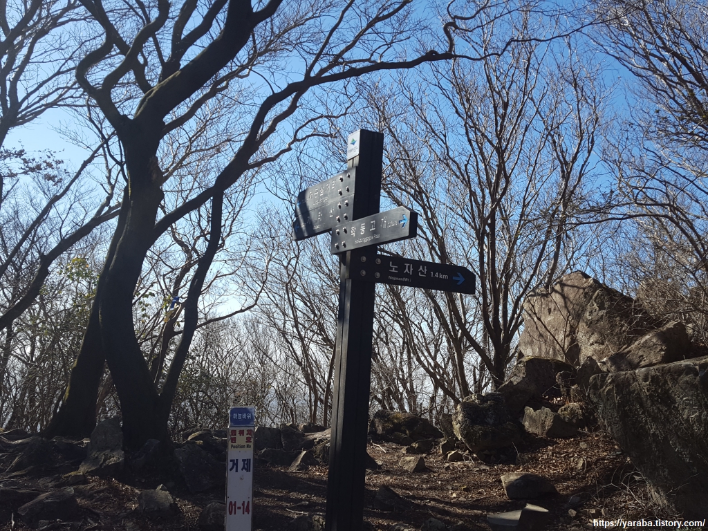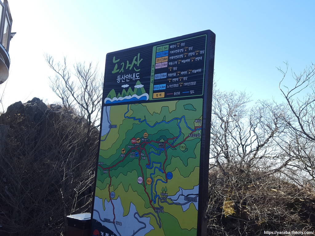 학동 고개에서 화장실을 찾다가 타게 된 케이블카로 노자산(557m)을 오르는 수고를 덜고 예상치 못한 풍경을 누리며 노자산에서 가라산으로 이어지는 능선 걷기를 본격적으로 시작한다. 동쪽의 해안선을 보며 남쪽을 향해 걷는 거제 최고의 절경이 이어진다.