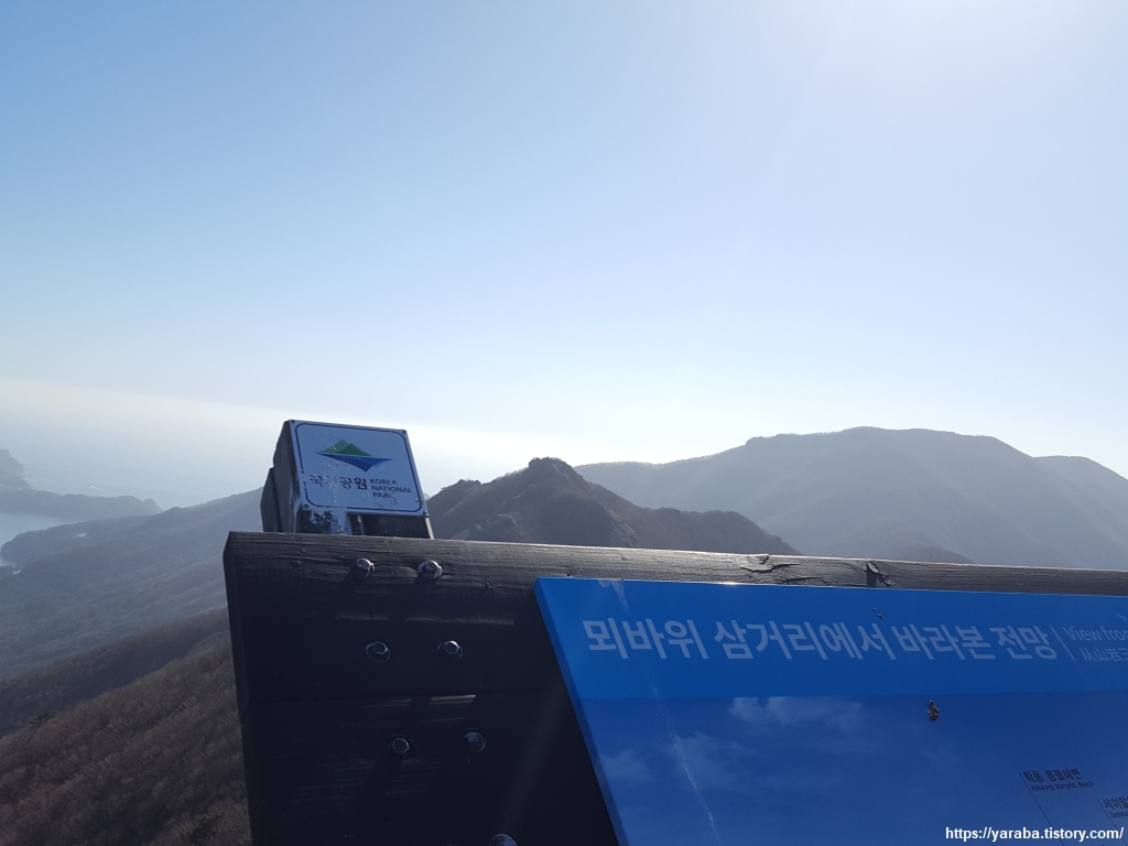 매가 앉아 있었을지, 까마귀가 앉아 있었을지, 새똥이 묻은 뫼바위 안내판 너머로 아름다운 학동 해안과 산 능선의 그림을 만난다.