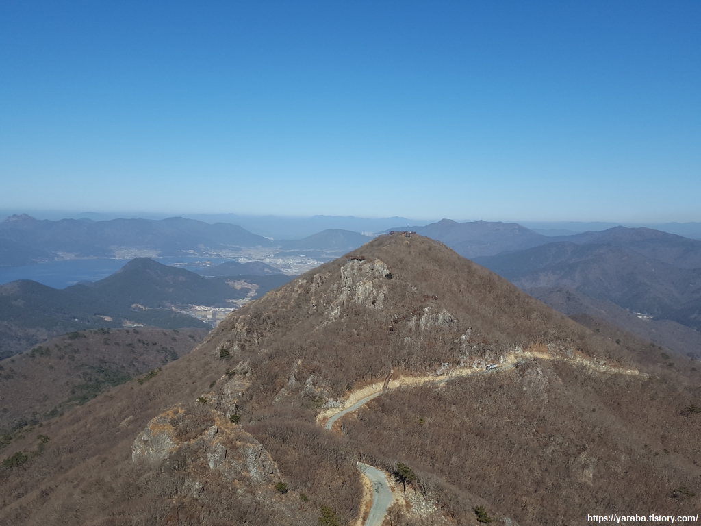 케이블카 승차장 안으로 들어가지 않아도 건물 바깥 주차장에 비데까지 있는 최고급 화장실이 있었다. 옆지기가 화장실에 다녀오는 사이에 여유롭게 주위 풍경을 감상한다. 정면으로는 노자산 정상부에 있는 케이블카 정류장을 비롯한 바위들이 어떤 풍경을 선사할까? 하는 궁금증을 낳게 한다. 산 아래로는 동부면 면사무소로 향하는 거제 중앙로도 보인다.