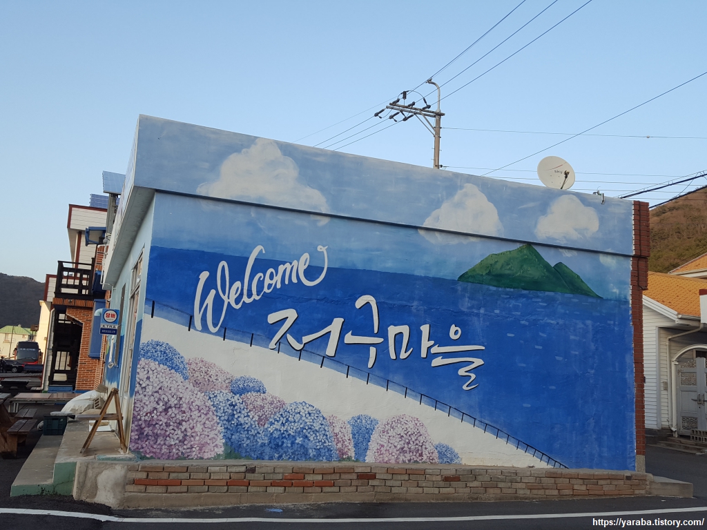 돼지 그림을 그려 놓은 저구 마을 벽화. 저구라는 말 자체는 멧돼지 입이라는 의미로 바다의 만 형태를 보면 진짜 멧돼지 입처럼 생겼다.