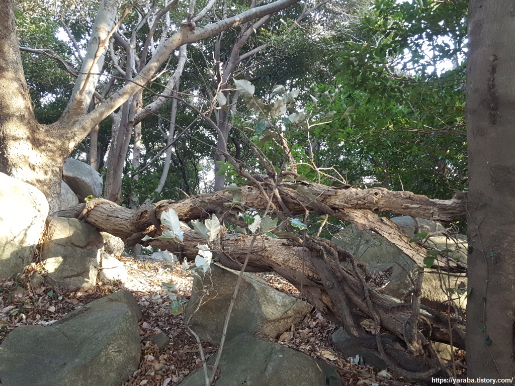 다대 산성을 지나 저구 삼거리로 향하는 길, 덩굴 식물에 암바를 당하듯 넘어져 있는 나무를 보니 아등바등 살아가는 인생사를 보는듯하여 씁쓸하다.