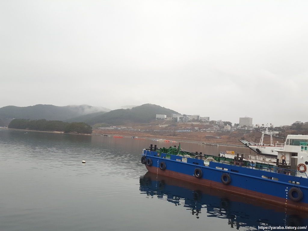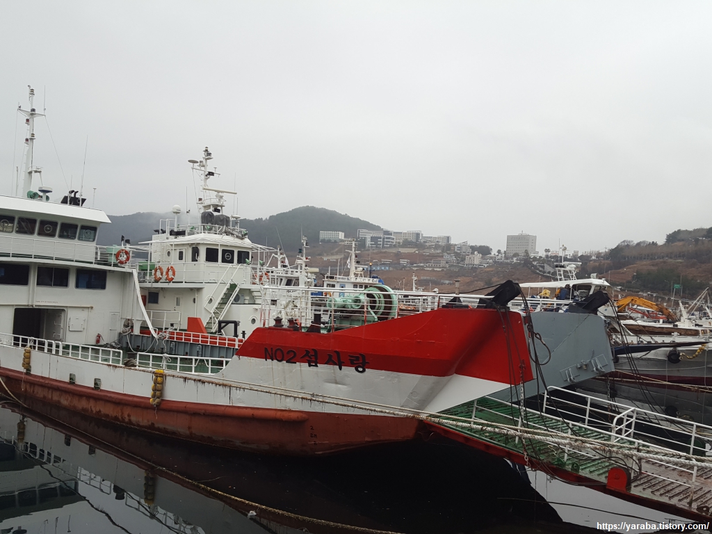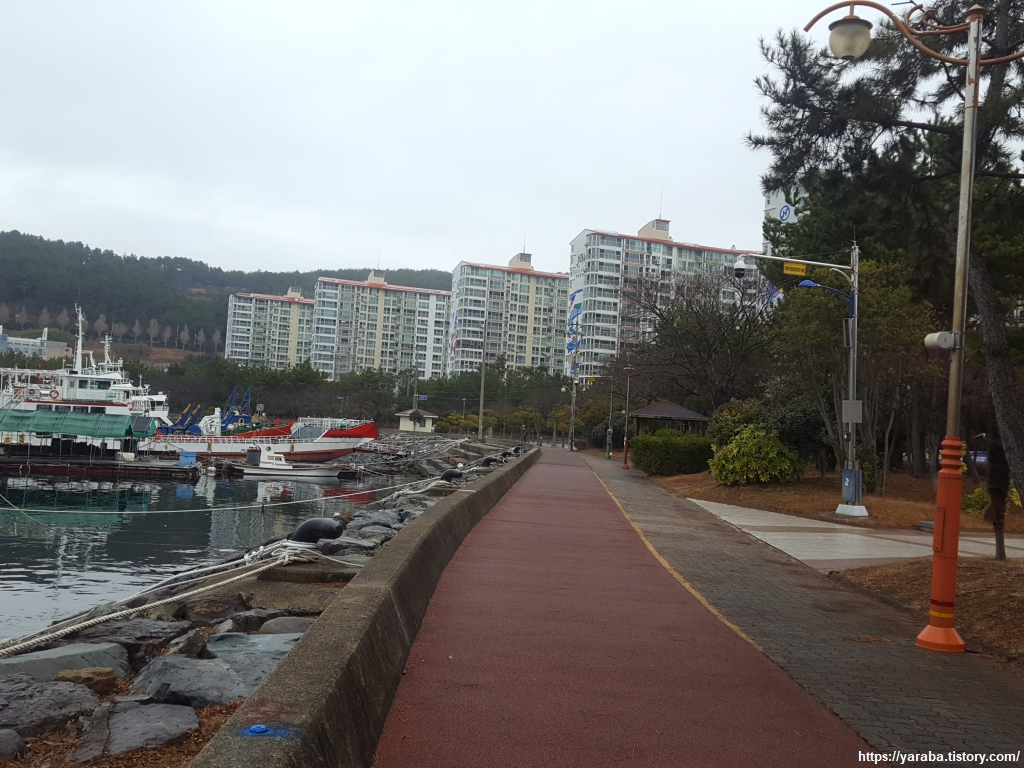 무전동 해변 공원에서 해안 산책로를 따라 북쪽으로 이동한다. 이곳은 바다에서 길게 들어와 있는 만의 끝자락으로 정식 여객선 터미널은 없지만 여러 섬을 오가던 여객선들이 정박해 있었다. 배를 운행하지 않을 때는 이곳에다가 세워두는 모양이다.