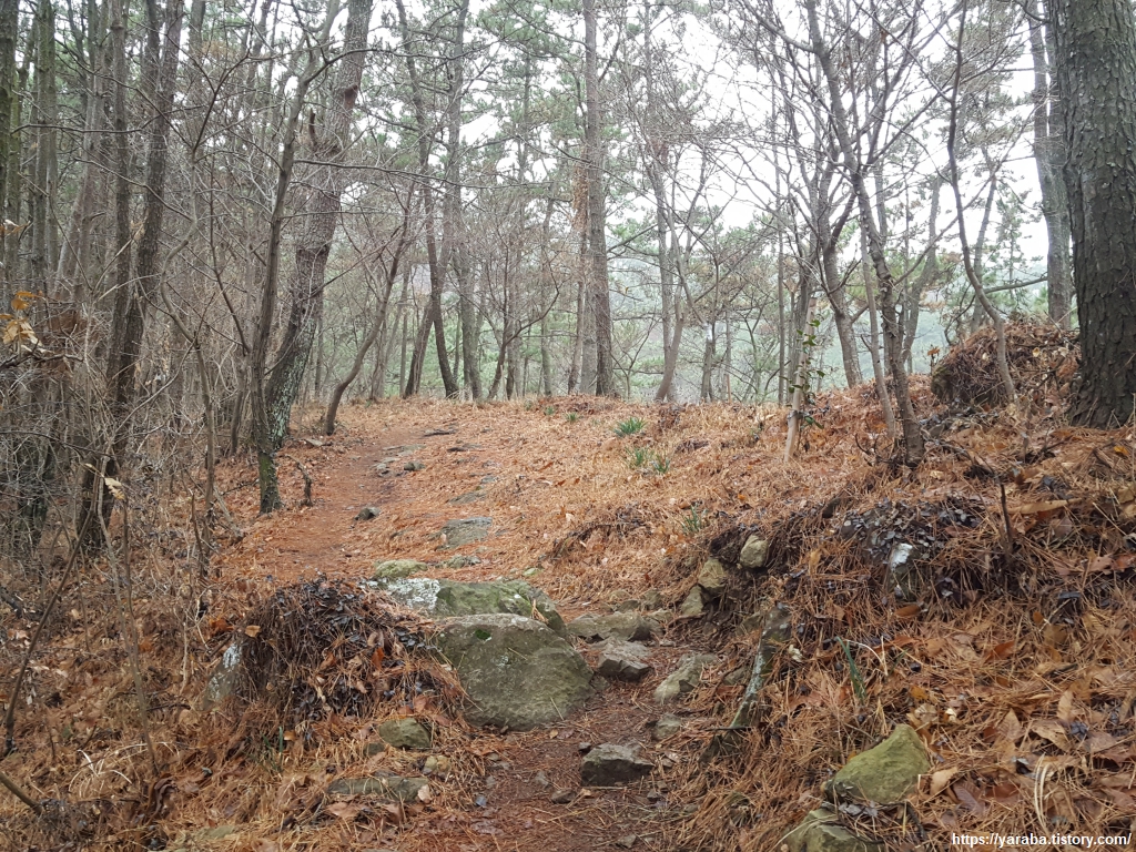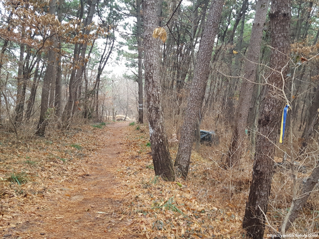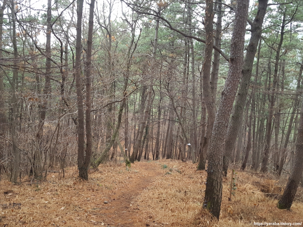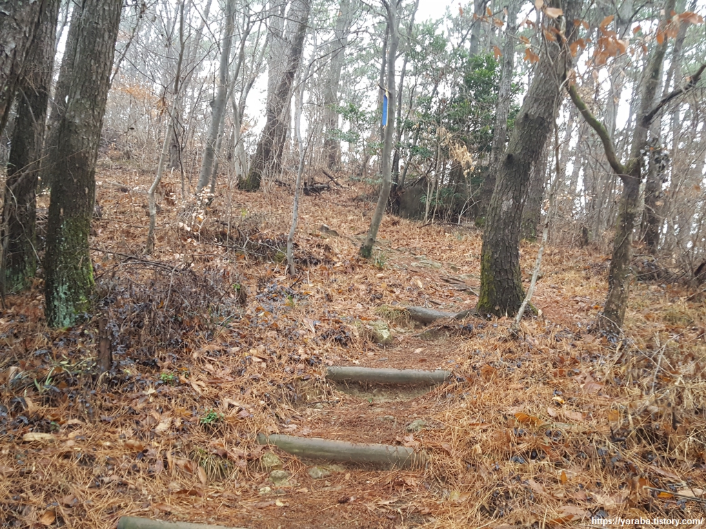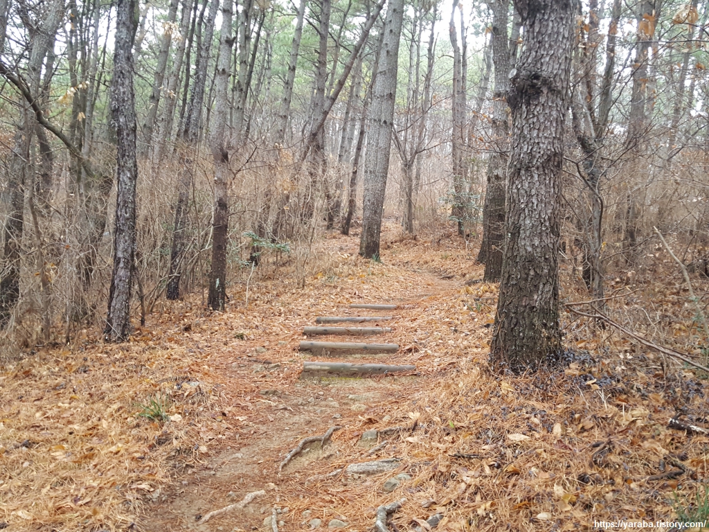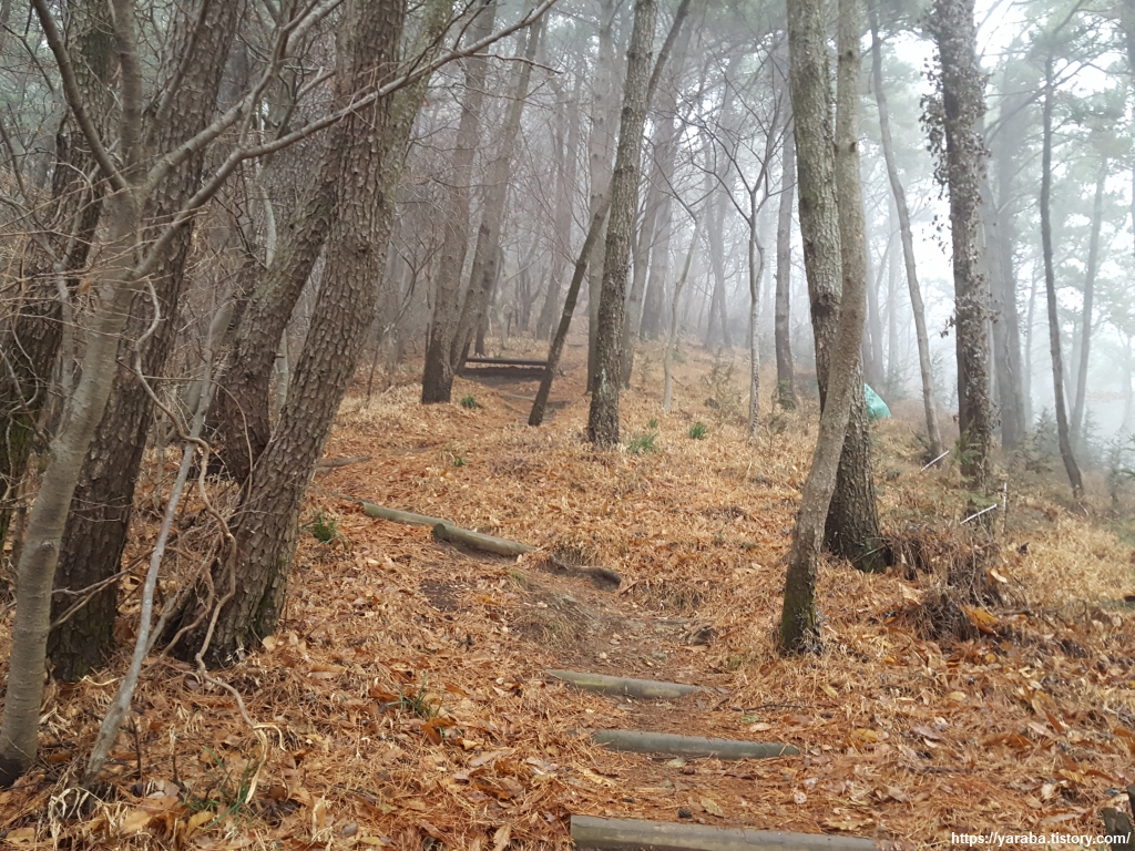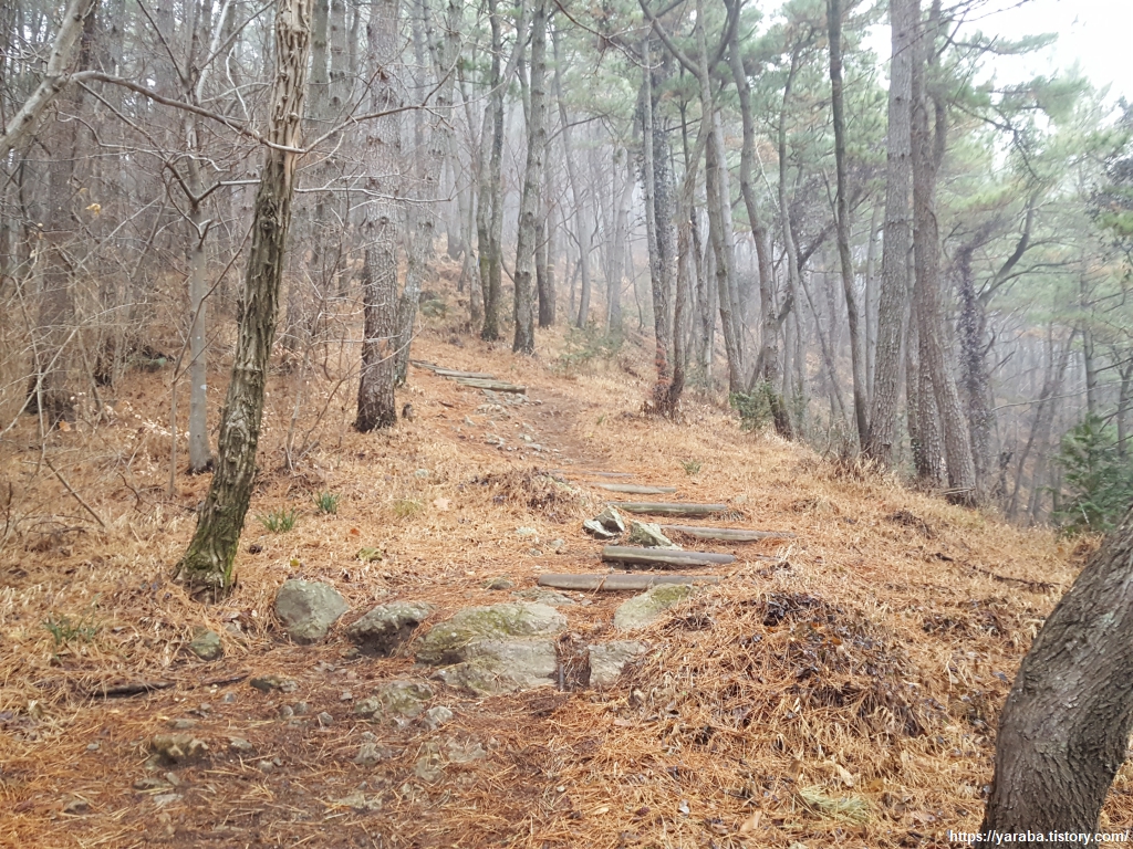 비가 내려 더욱 많이 떨어진 솔잎을 밟으며 솔향 가득한 숲길을 이어간다.