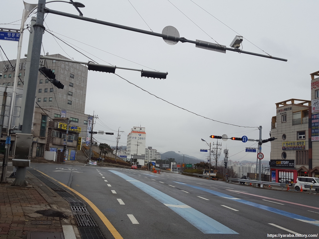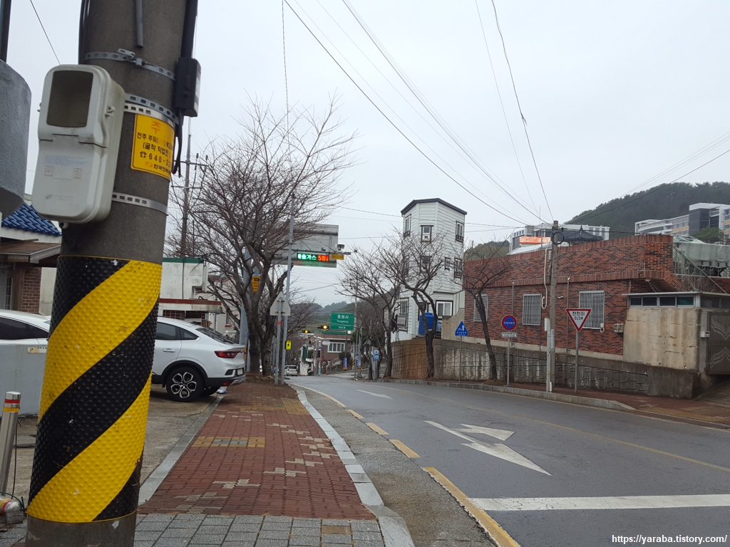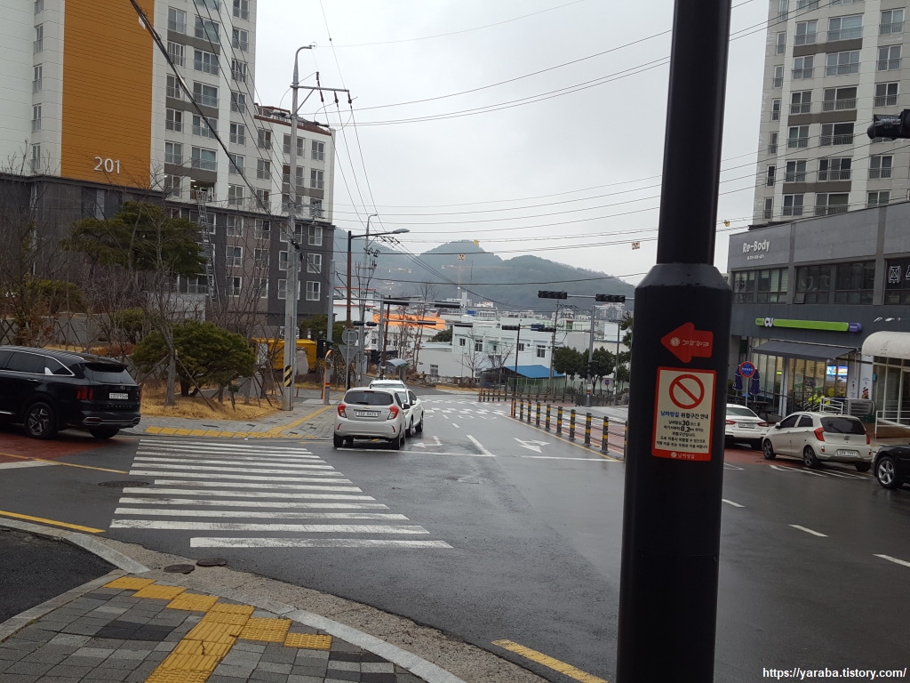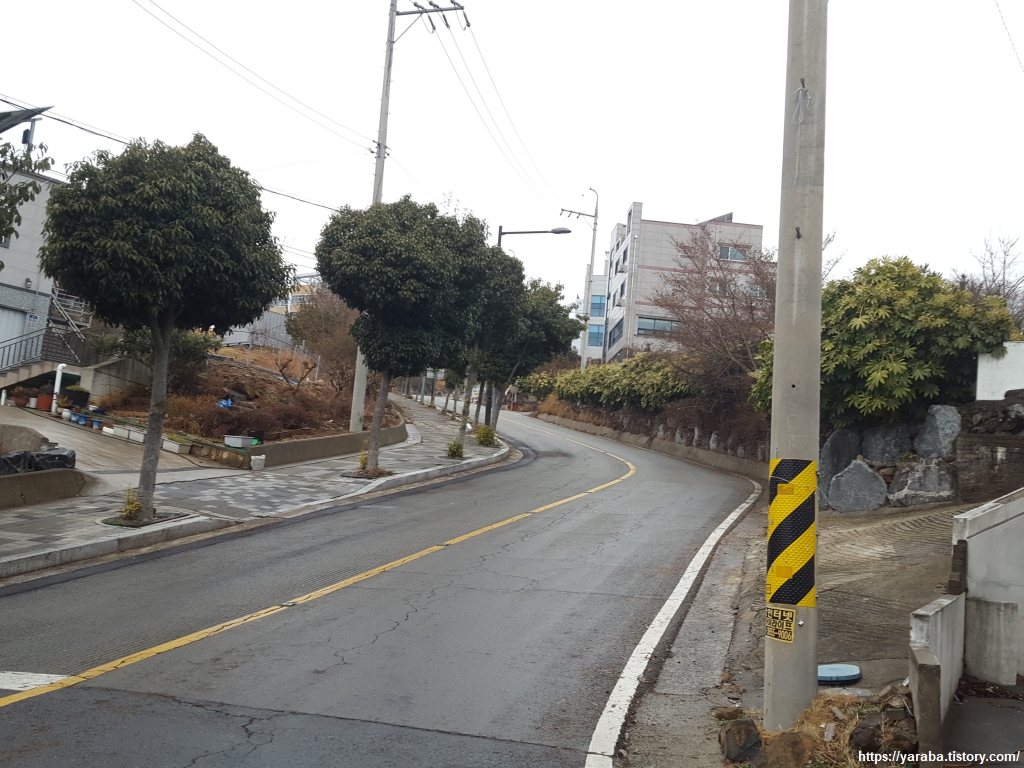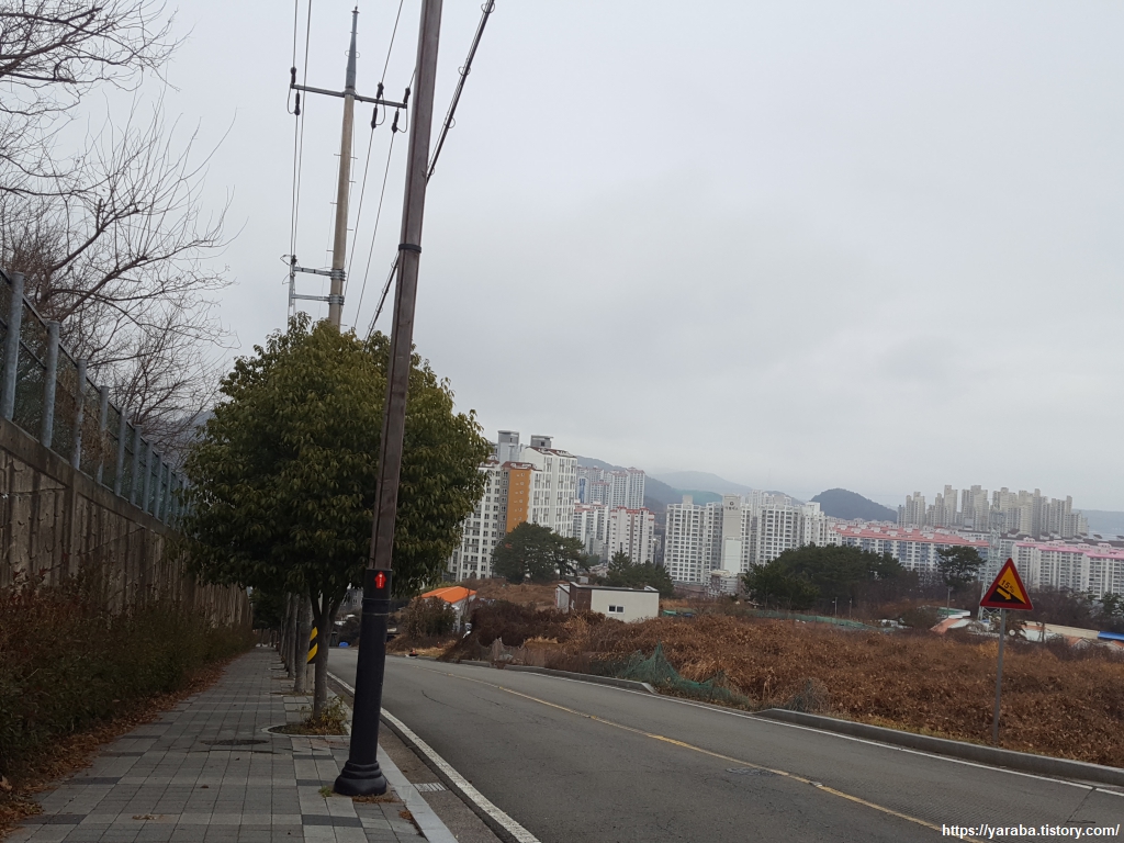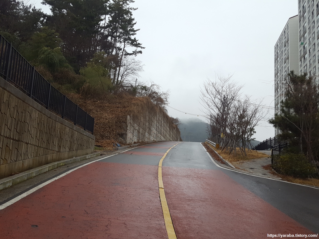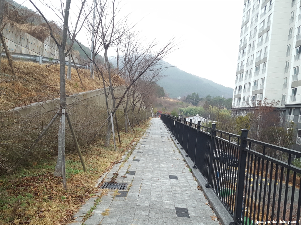예전에는 인도가 없는 도로를 지나야 했던 모양인데 지금은 아파트 단지 뒤로 산책로가 있어서 위험하지 않게 길을 이어갈 수 있었다. 단점이라면 산책로 높이에 있는 아파트 주민과 눈이 마주칠 수 있다는 것이다. ㅎㅎ