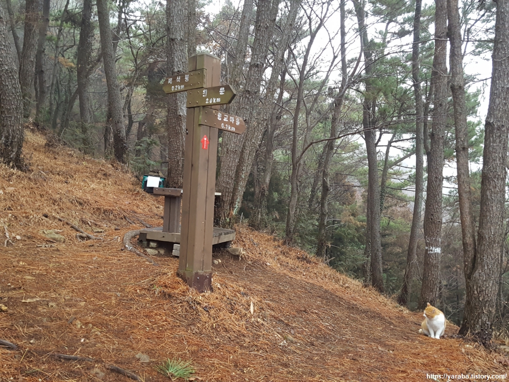 자욱한 안갯속에서 주위를 볼 수 없지만, 좌측으로는 바닷가 용호리 가는 길림길, 우측으로는 통영 향교가 있는 향교 마을로 가는 갈림길을 차례로 지난다. 고양이 한 마리가 이곳은 내 영역이야!라는 하는 듯 야옹야옹한다. 부모는 고양이를 그리 좋아하지 않지만 독립한 아이들은 모두 고양이 집사인 우리 집을 생각하면 아무 일 없듯 그냥 지나치기가 쉽지 않다. 주인이 책임을 지지 않으면서 길고양이에게 거처와 음식을 마련해 주는 것은 좋지 않다는 의견이 많지만 포획, 중성화, 방사라는 과정을 거치려면 이렇게 정기적으로 밥을 주는 것이 필요하다고 한다.