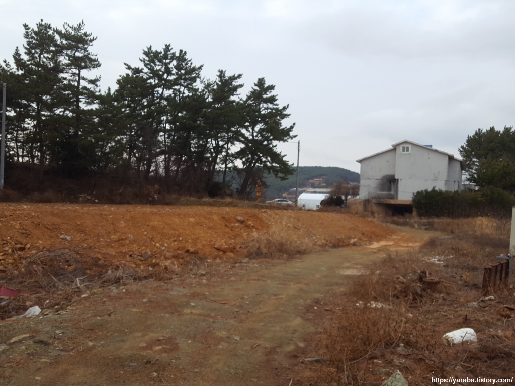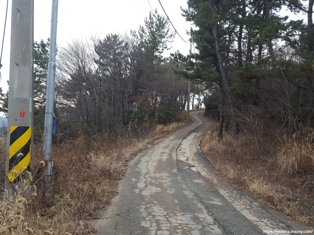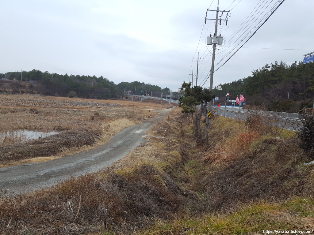 멀리 나지막한 곡산이 눈에 들어온다. 우리는 저 곡산 아래 자락 주위를 돌아서 가야 한다. 물이 들어온 해안길을 계속 걸어간다.