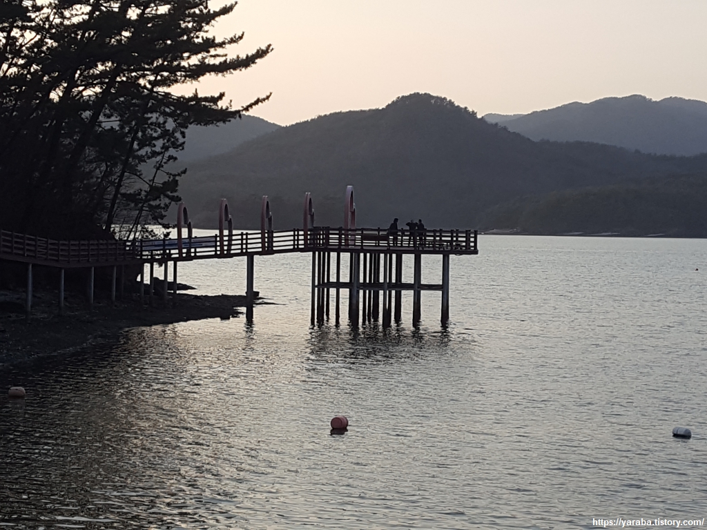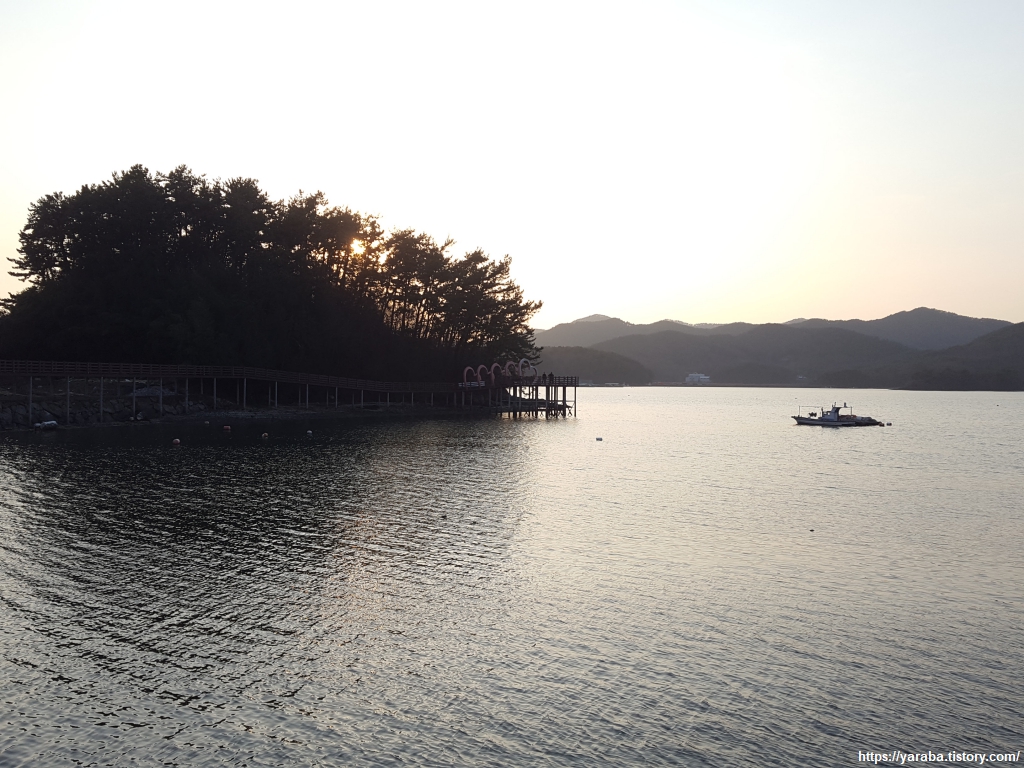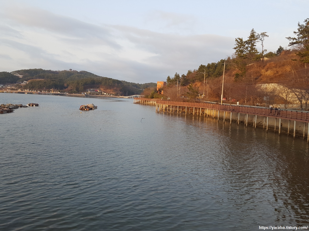 잔잔한 호수와 같은 고성만은 거울처럼 석양을 비춘다. 편안하게 데크길을 걸으며 일몰을 감상한다.