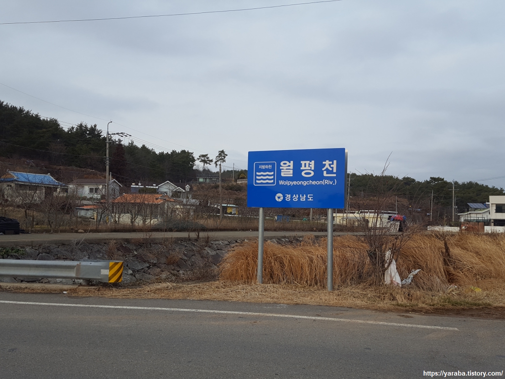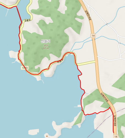 고성읍 신월리로 들어선 남파랑길은 월평천을 건너서 좌회전하여 곡산 자락의 해안길을 걷기 시작한다.