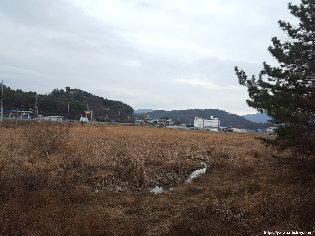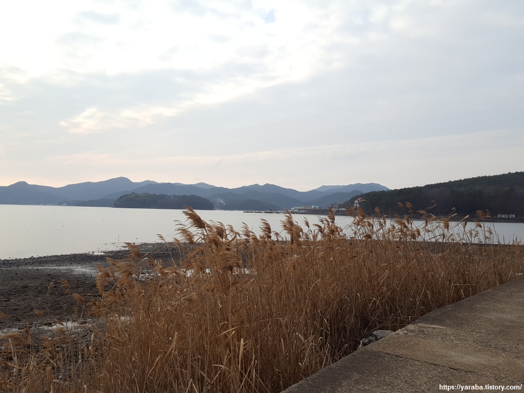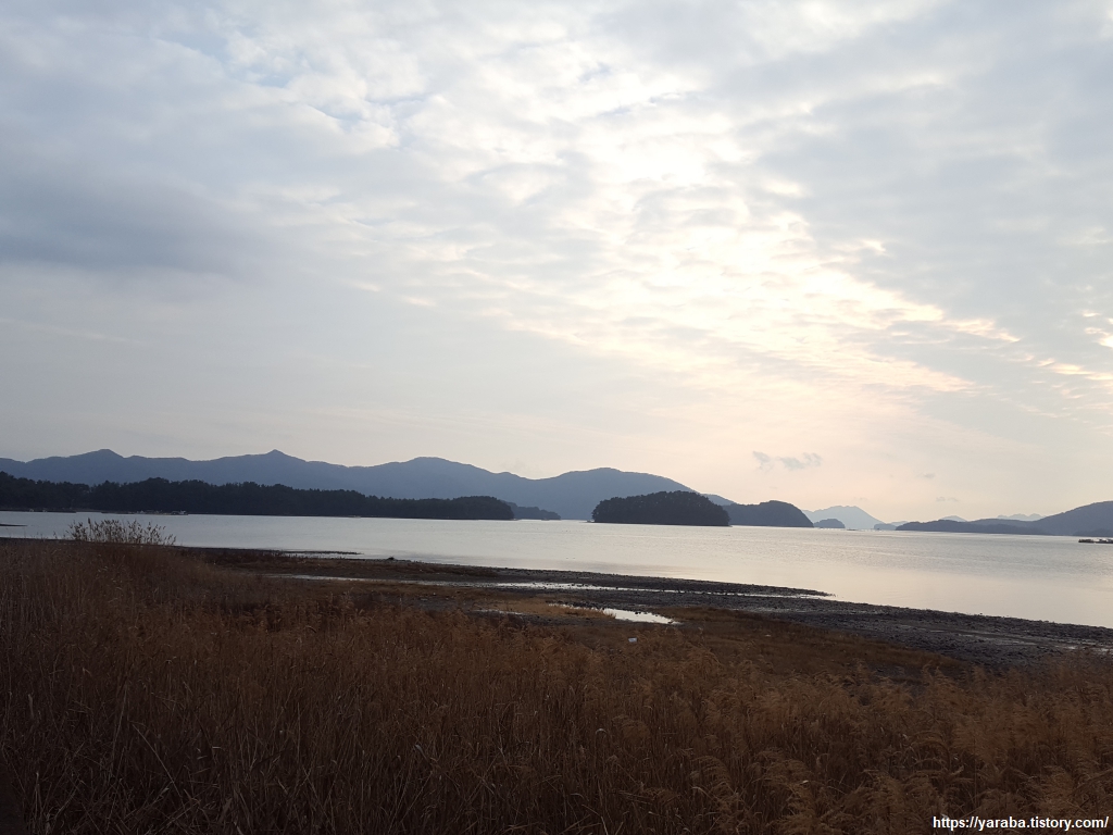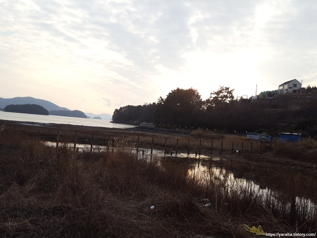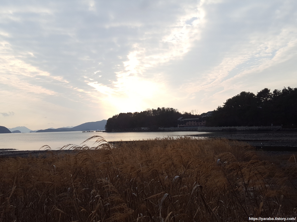 해가 지고 있는 시간의 해안 풍경은 자꾸 발걸음을 멈추게 한다. 찬란한 석양은 없지만 곡산 앞의 새섬도 갯벌 끝자락의 갈대도 흐린 겨울 저녁의 명품 풍경을 만든다.