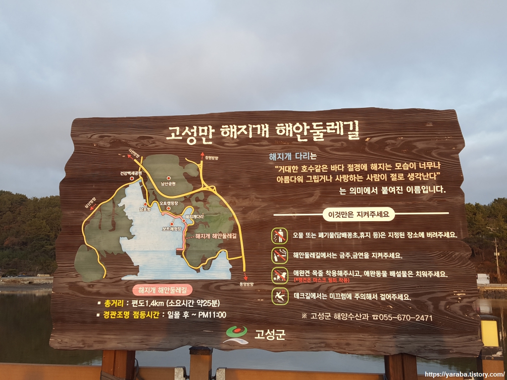 석양도 아름답지만 밤 11시까지 조명이 있다고 하니 해지개 해안 둘레길은 고성 밤바다를 제대로 누릴 수 있는 공간이기도 하겠다. 우리는 해지개 다리를 내려와 좌회전하여 해지개 해안 둘레길을 마저 걸어 오토 캠핑장을 지나고 남산 공원을 오른다.