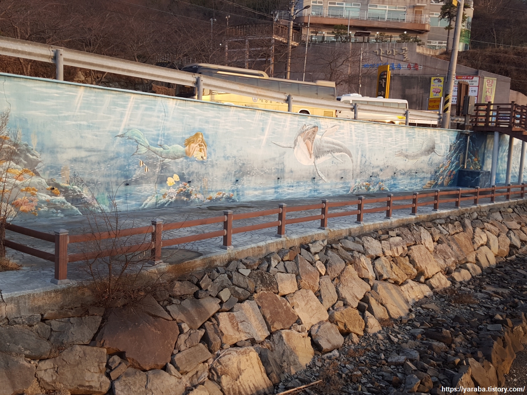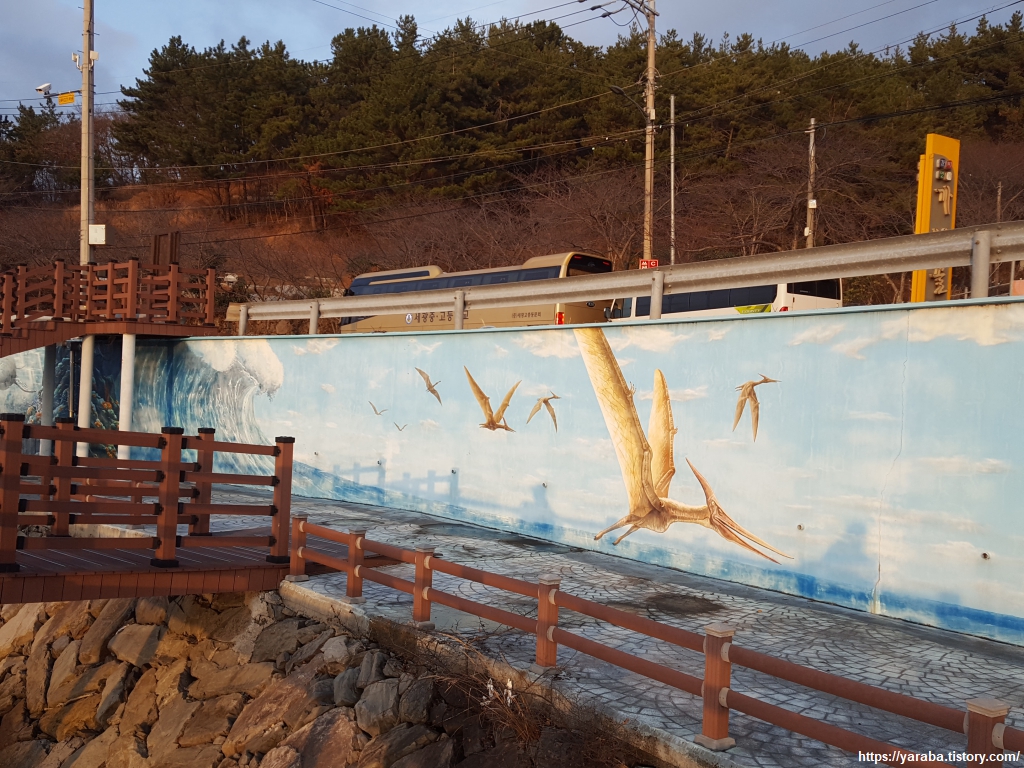 공룡의 도시 고성 답다고 해야 할까? 데크길 쉼터에 앉아 잠시 쉬어 가는데, 해안길 벽면에는 공룡 시대를 그려 놓았다. 험악하게 생긴 공룡들 사이로 눈길을 끌며 미소 짓게 하는 포인트는 인어였다. 인어가 헤엄치며 손으로 하트를 그리고 있다.