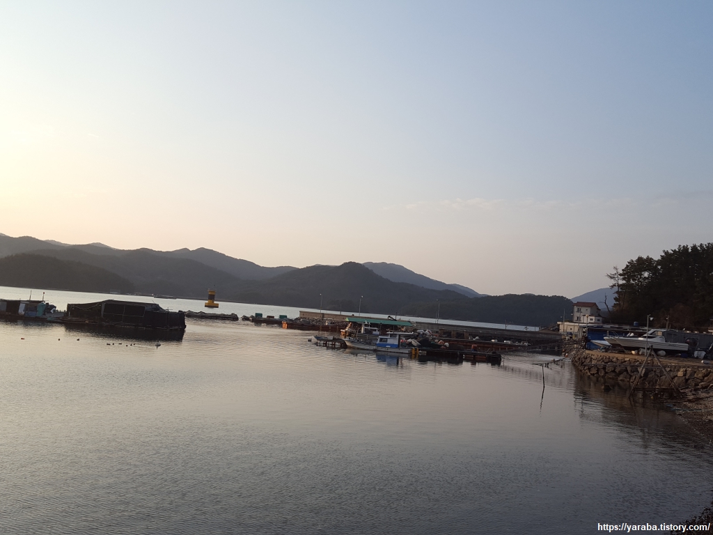 흐린 하늘이 물러가기 시작하고 황혼이 찾아오고 있는 시간의 고성만 바다는 감성 충만한 공간이다.