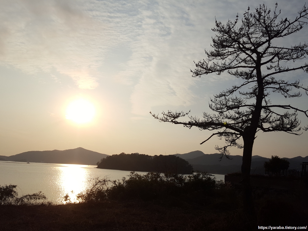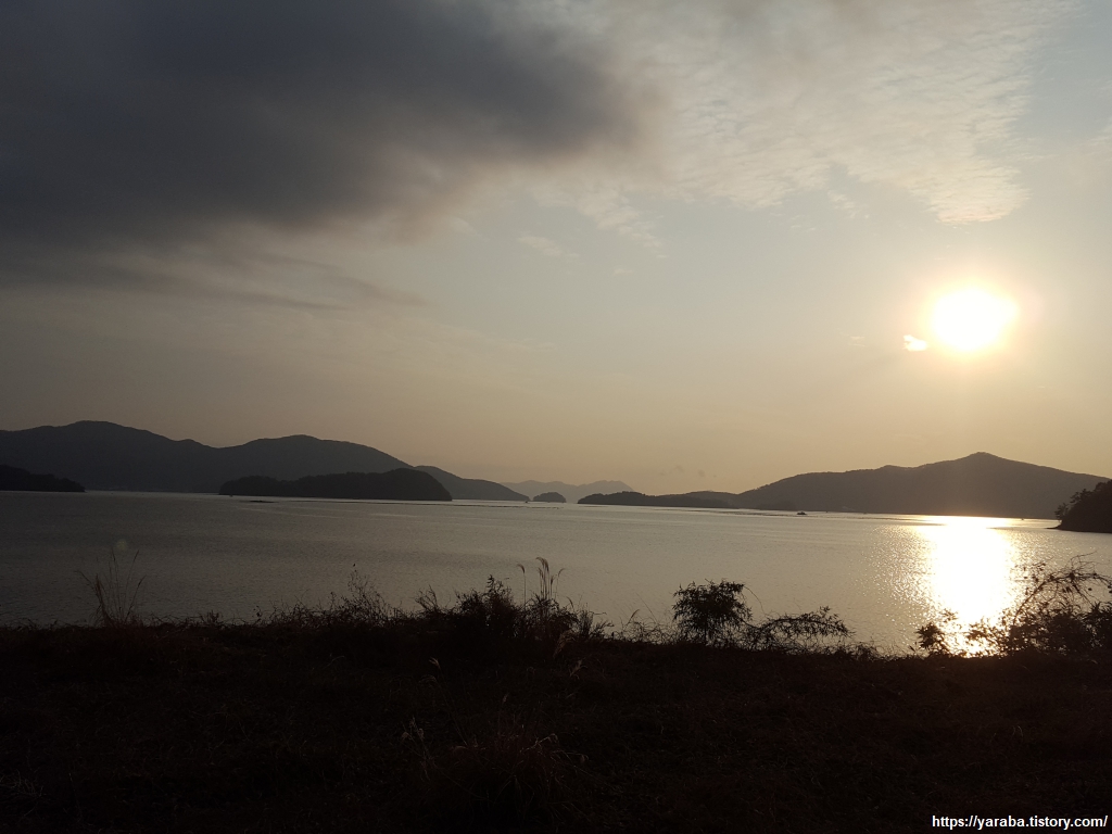 해는 고성의 산 아래로 내려가기 직전이다. 고성만 바다는 황금물결이 반짝이고 멀리 해지개 다리가 보이기 시작한다.