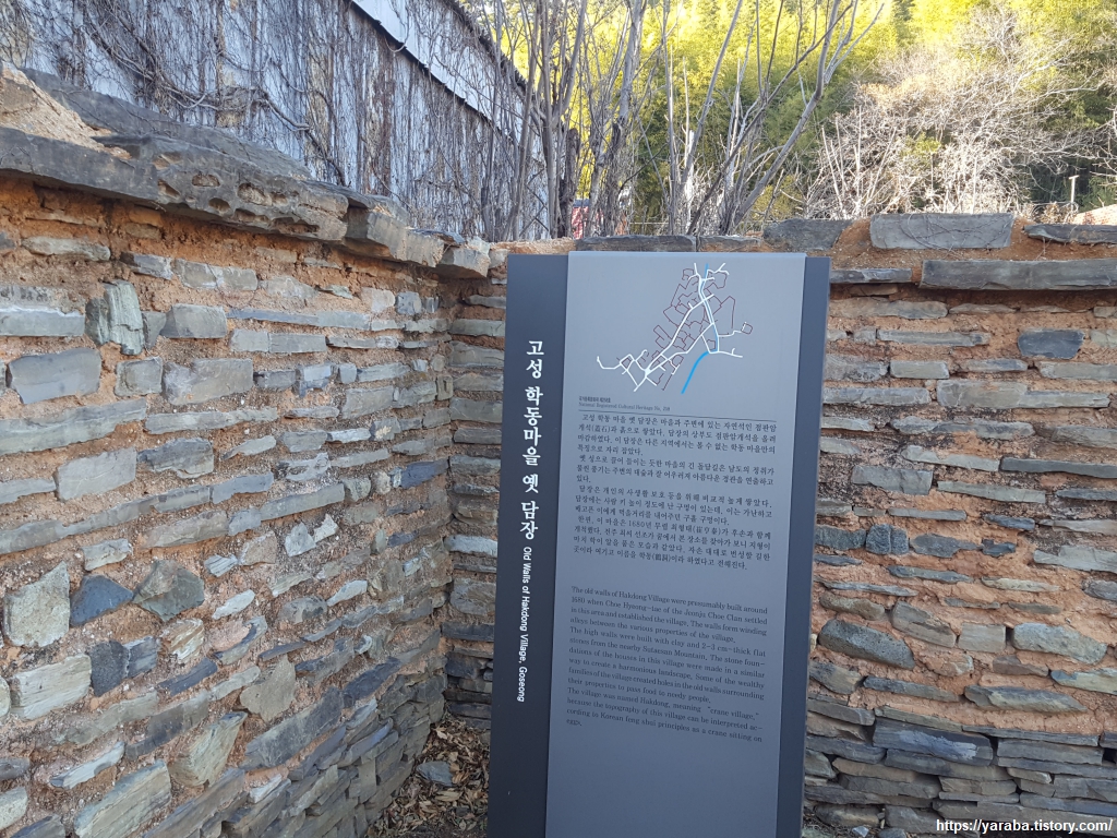 계곡을 따라 내려가는 학동로 내리막길은 넓고 완만한 길만큼이나 걷기에 편안한 길이었다. 고성 학동 마을 옛 담장이라는 안내 표지판이 등장했다. 표지판을 보니 아하! 32코스에서 놓치지 말아야 하는 경로구나! 하는 직감이 훅 들어온다. 실제로 놓치지 말아야 할 구간이었다.