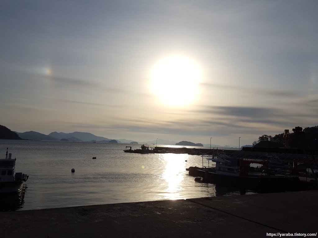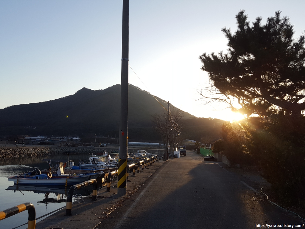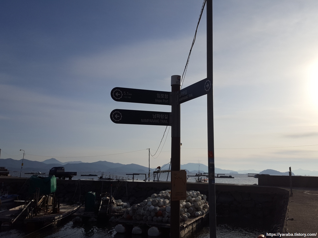 석양을 받아 황금빛으로 물들고 있는 임포항을 떠나 남파랑길 33코스를 시작한다. 임포라는 마을 이름은 방풍림이 있는 포구라서 붙은 이름이라고 하는데 포구 주변으로는 방풍림이라 불릴만한 나무숲은 볼 수 없었다. 방풍림을 잘 가꾸고 보존했다라면 또 다른 명소가 되었을 텐데 하는 아쉬움이 있다.