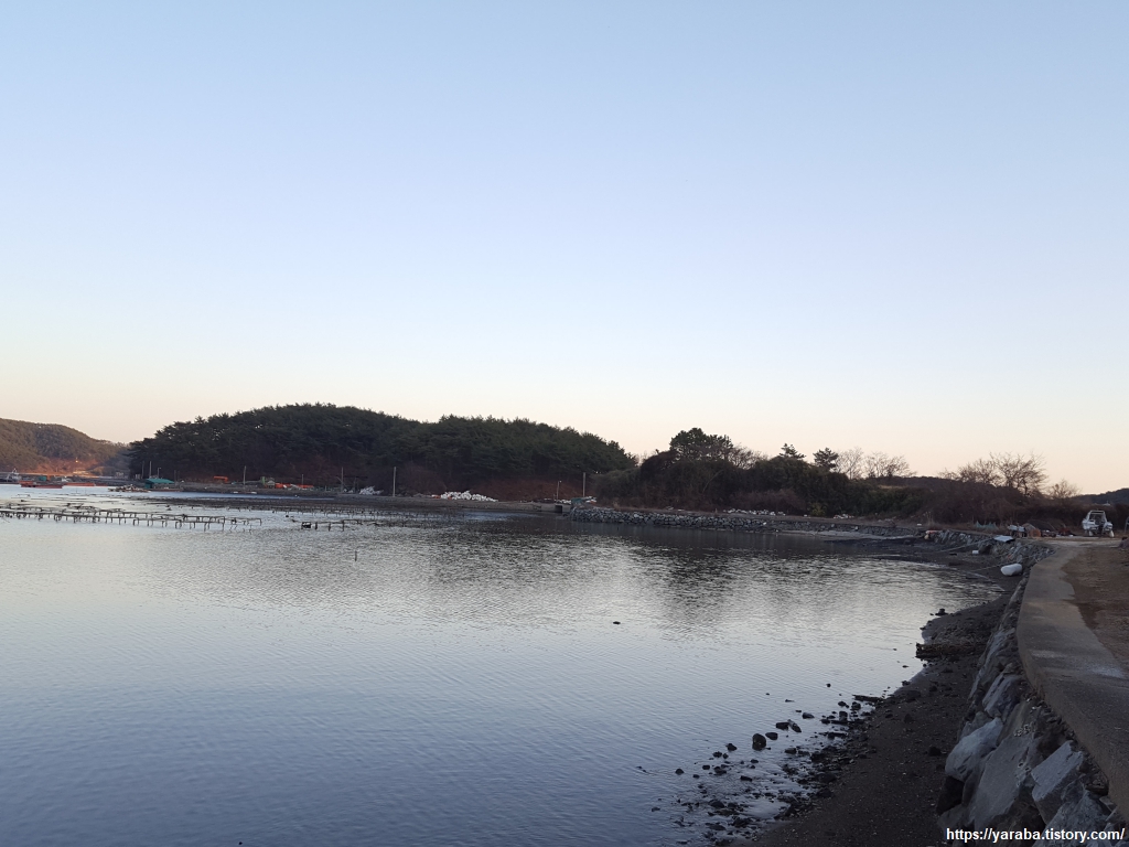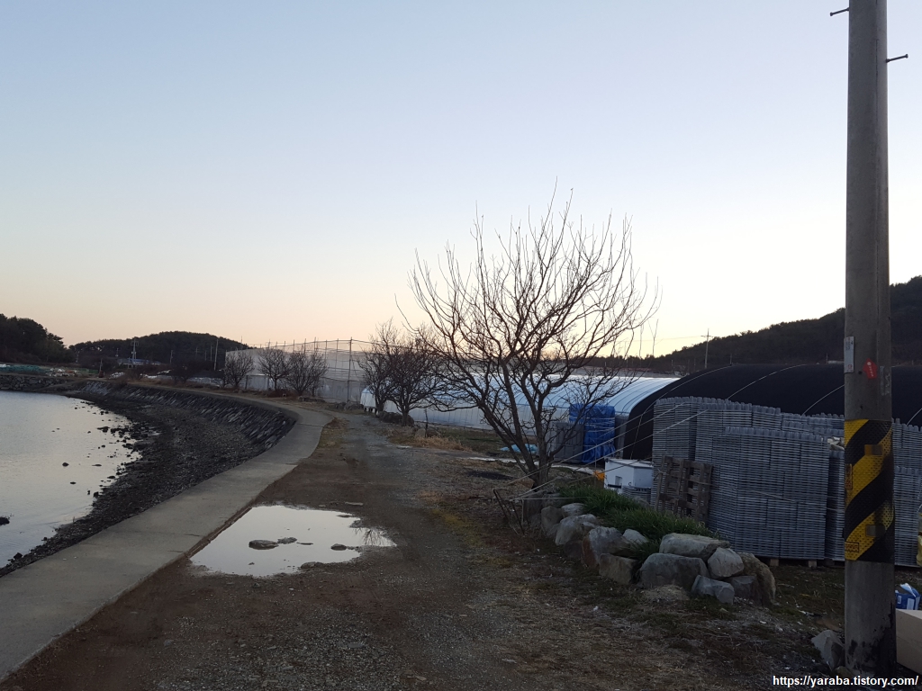 굴양식에 사용하는 가리비 껍데기가 포구에 산더미처럼 쌓여 있다. 가리비 껍데기가 굴껍데기보다 굴 종묘 생산에 유리하다고 하지만 가리비 껍데기를 일본에서 수입하기도 했다는 뉴스를 보니 마음 한 구석이 더부룩하다. 길은 포구 끝에서 해안 도로로 올라가 당분간 도로변을 걷게 된다.