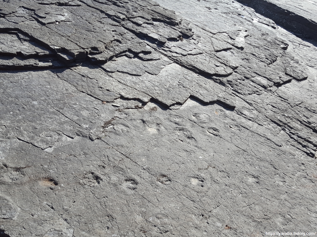 상족암 군립 공원을 향해서 걷는 해안길의 인도에는 공룡 발자국들이 새겨져 있다. 공룡들이 이곳을 우리처럼 걷지는 않았을지라도 그 당시 존재했던 생명체가 살았던 시대를 마구 상상하면서 걷게 되는 길이다.