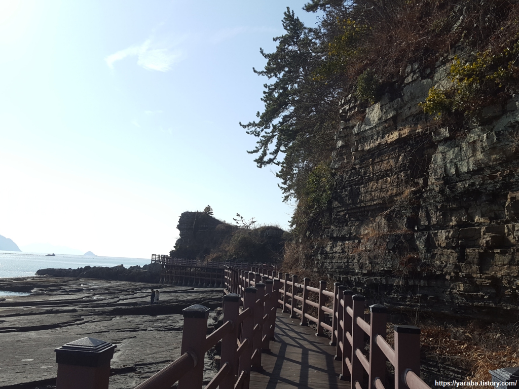 바위 절벽으로 지층이 적나라하게 드러난 해안 길을 따라 과연 공룡 발자국은 어떻게 생겼을까? 하는 호기심을 가지고 길을 이어간다.