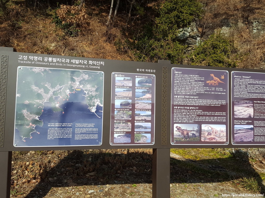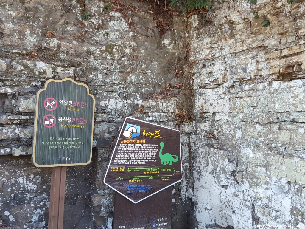 물개 모양의 상족암 조형물을 뒤로하고 제전항으로 향하는 길, 공룡 화석지 해변길 안내판에는 고성에만 공룡 발자국이 5천여 개 발견되었다는 이야기가 적혀있다. 미국 콜로라도, 아르헨티나 서부 해안과 더불어 세계 3대 공룡 발자국 화석 산지라고 한다.