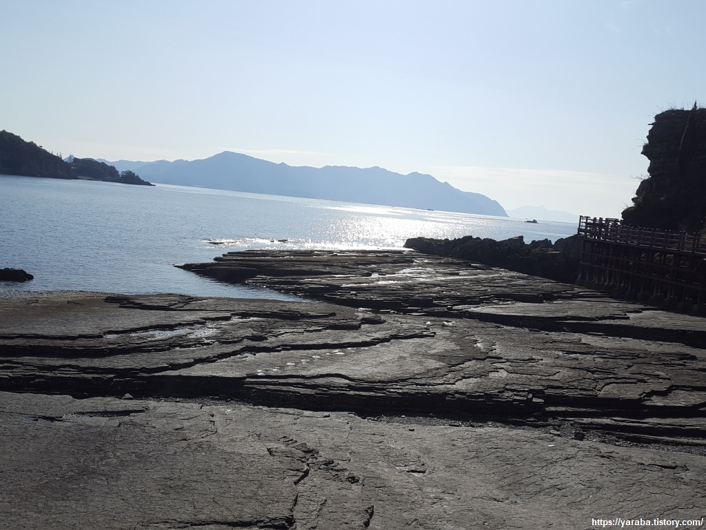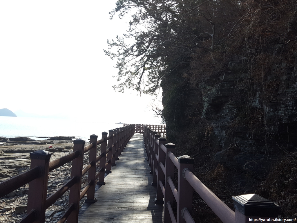 상족암 군립 공원으로 가는 해안길, 바위 해안 위로는 데크길을 설치해 놓았다. 관광객들을 위한 시설이겠지만 공룡 발자국이 있을지도 모르는 바위 위에 굳이 데크길을 설치해야 했을까? 하는 생각도 해보았다.