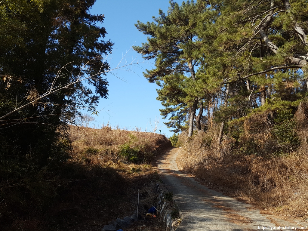 숲길을 지나며 경남 고성군 하일면 춘암리에서 하이면 월흥리로 넘어간다.