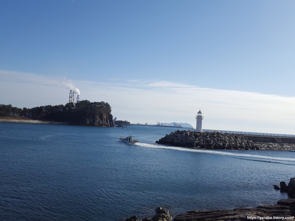 오후의 태양을 살짝 피해서 신향 마을 포구의 방파제와 남일대 코끼리 바위를 앵글에 담으니 비현실적인 그림이 나온다. 항구를 빠져나가는 배 한 척이 절묘한 순간에 캔버스에 등장한다. 삼천포 발전소의 굴뚝조차 시골집 굴뚝에서 나오는 연기 같다.