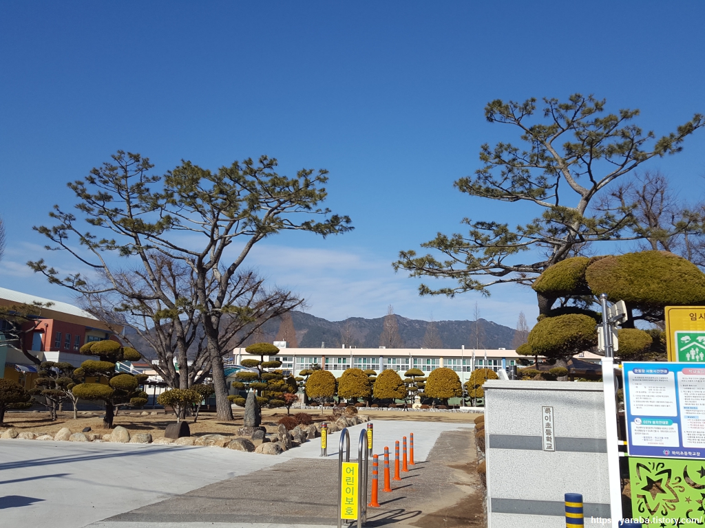 학교 입구에 있는 커다란 소나무가 인상적인 하이 초등학교 앞을 지나면서 남파랑길 34코스를 시작한다. 아직은 고성군 하이면에 속한 지역이다.