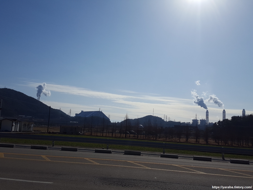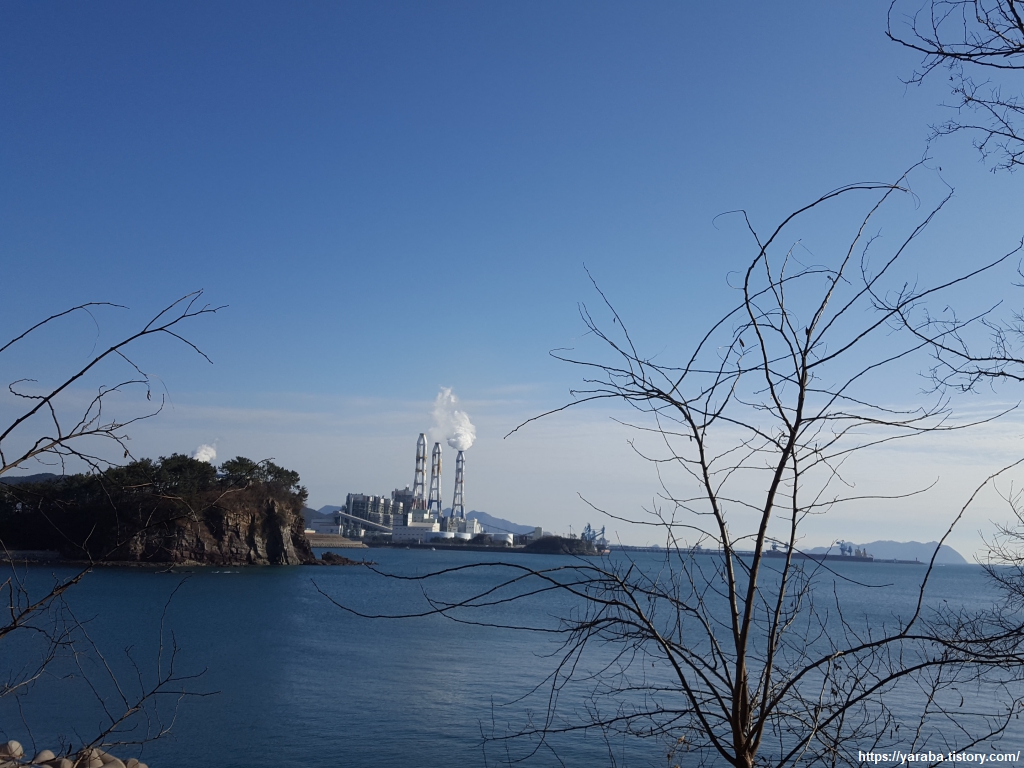 77번 국도 옆을 걸어가는 길 좌측으로는 하이면 덕호리 해변에 자리 잡은 삼천포 화력 발전소가 증기를 내뿜으며 열심히 일을 하고 있다. 석탄 화력 발전소의 퇴출 요구 속에서 어떤 미래를 맞이할지 모르겠다.