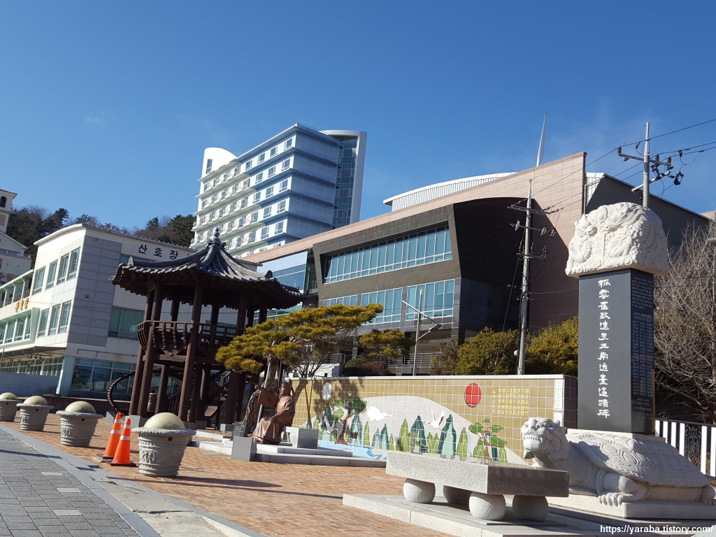 바다를 가라키고 있는 최치원의 동상 앞에 범해(泛海, 바다에 배 띄우다)라는 시비를 세워 놓았다.