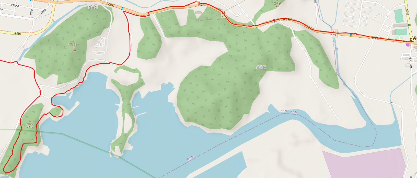 경남 고성군을 떠나 사천시로 들어선 남파랑길 34코스는 남일대 직전까지 77번 국도 남일로 도로변을 걸어야 한다. 남일대 해변을 돌아서 가면 진널 해안산책로를 걸을 수 있다.