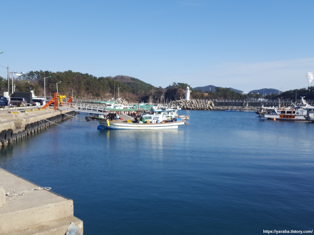 신향 마을 포구로 들어오는 배 한 척이 그리는 물결, 오후의 태양이 만드는 은빛 물결, 그 가운데 존재감을 뽐내는 등대와 푸른 하늘과 눈부신 태양까지 한 폭의 그림이다.