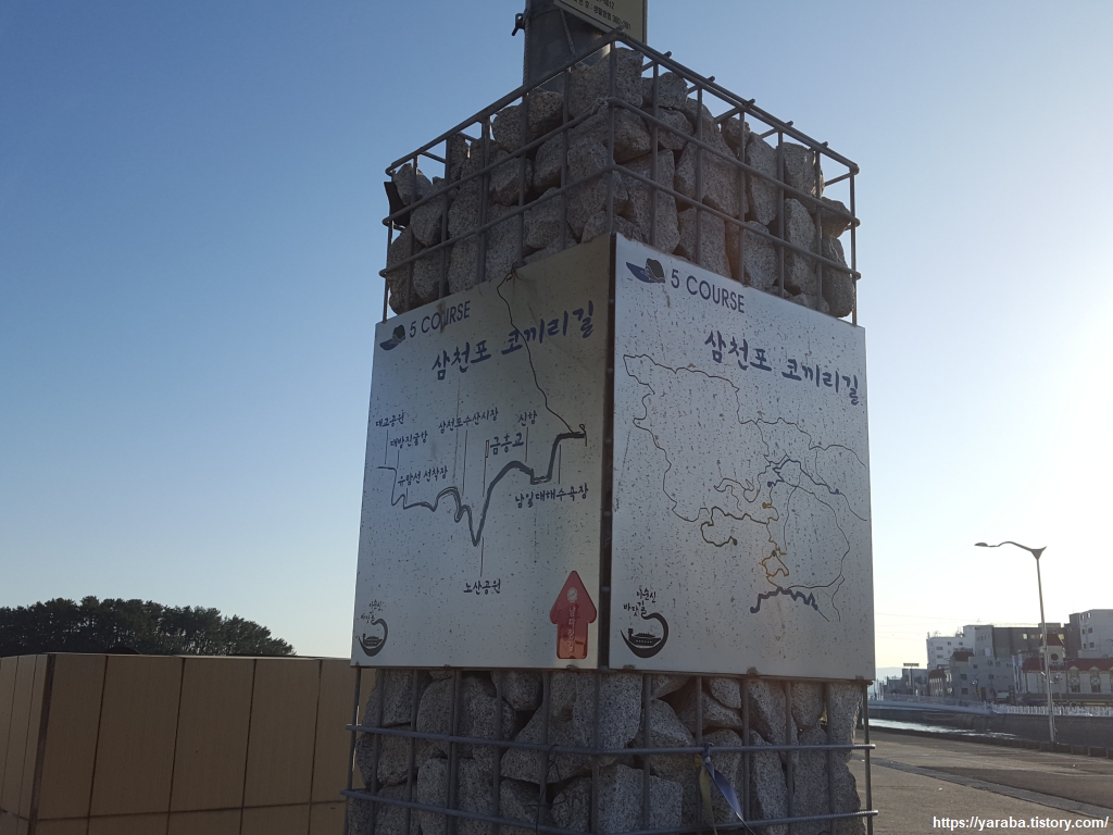 지금 걷고 있는 길은 사천시의 "삼천포 코끼리길"과 함께 하고 있다. 지금까지 보아온 걷기 길 표지판 중에 가장 럭셔리하지 않나 싶다. 남일대 해변의 코끼리 바위가 길 이름에 영향을 준 모양이다.