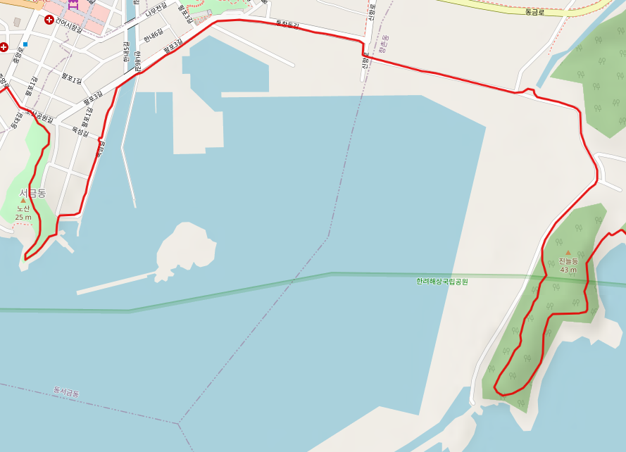 진널 해안 산책로를 걷는 남파랑길 34코스는 진널 반도를 한 바퀴 돌아 삼천포 신항을 가로질러 노산 공원으로 향한다.