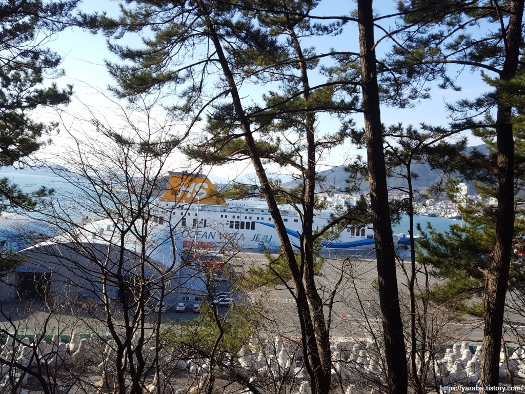 진널 전망대를 지나면 좌측으로 삼천포 신항을 보면서 길을 이어간다. 바로 옆으로 삼천포 신항과 제주를 오가는 거대한 여객선이 출항을 준비하고 있다. 6시간 30분이 걸리는데 삼천포에서는 23:30에 출발하여 제주에 6시에 도착하고(월요일 휴항), 제주에서는 2시에 출항하여 삼천포에는 20:30에 도착(화요일 휴항)한다고 한다.