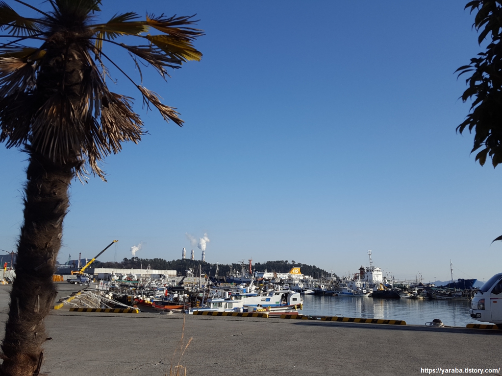 목섬에서 이어진 커다란 방파제 뒤로 보이는 삼천포 화력 발전소의 굴뚝은 이곳 인근 어디에서도 볼 수 있는 자연스러운 랜드마크가 아닌가 싶다.