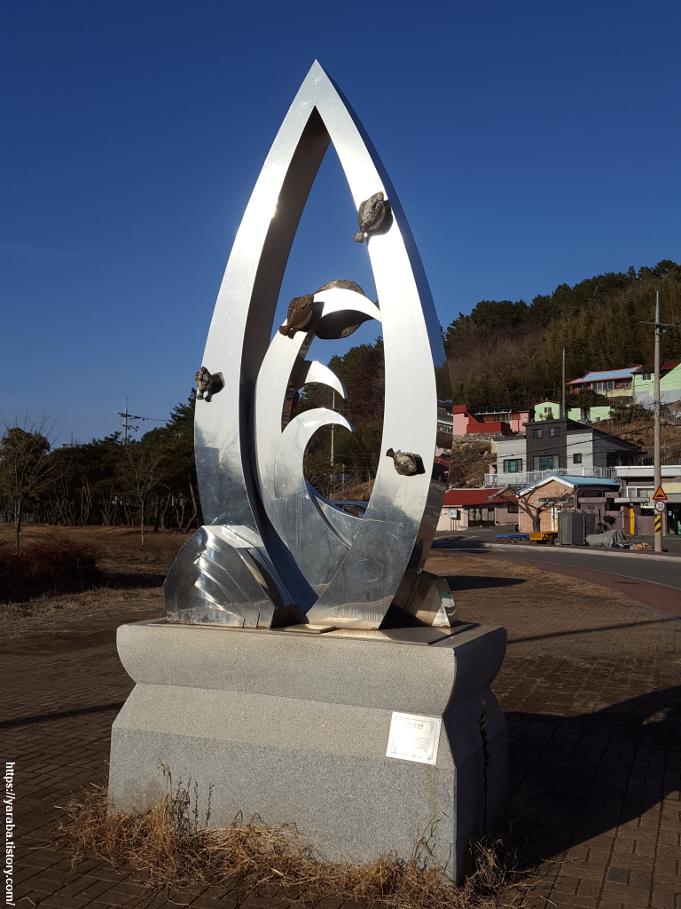 오랜 세월의 흔적이 있는 갯바위에 위에 있는 시멘트 기단과 동상이 조금은 뜬금없다 싶지만 1965년 은방울 자매가 불렀다는 "삼천포 아가씨" 노래를 소재로 세운 것이다. 석양빛을 받아 더욱 빛난다. 노래 가사를 보면 님을 그리워하는 삼천포 아가씨의 마을이 제대로 드러난다. 필자도 남해의 금산에 갔다가 삼천포에서 배를 타고 부산으로 간 적이 있었는데 그때의 추억을 떠오르게 하는 노래다.